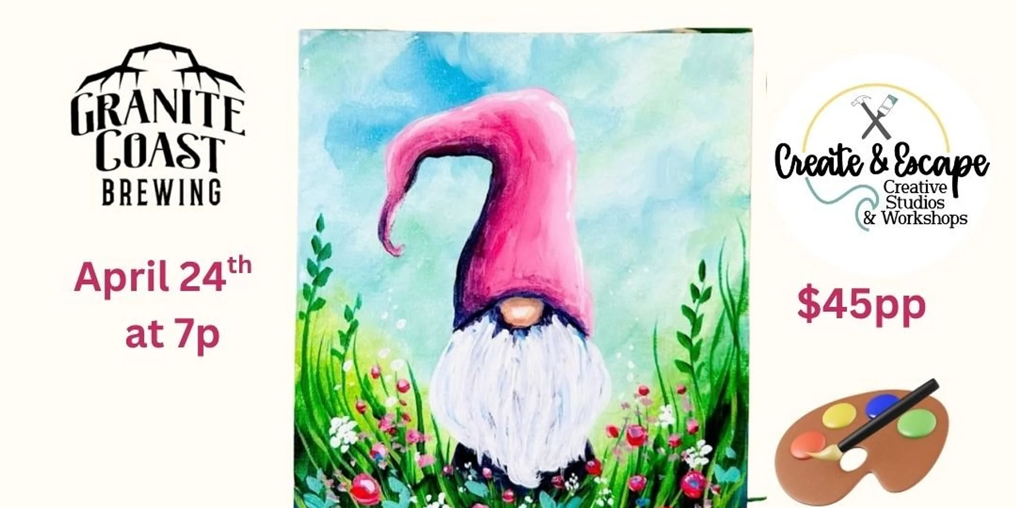🎨 Canvas Sip & Paint – Spring Garden Gnome Get tickets Join us for a fun and relaxing night at Granite Coast Brewing as we paint this adorable gnome canvas together!✨ 💲 $45 per person (Includes your full project + a drink!) Alcoholic beverages for 21+ only. Non-alcoholic drinks are available. No experience needed — we’ll guide you step-by-step. Grab your friends, sip something delicious, and create something you’ll love. 💛 Spots fill fast — reserve yours today! Questions? Contact createandescape@outlook.com