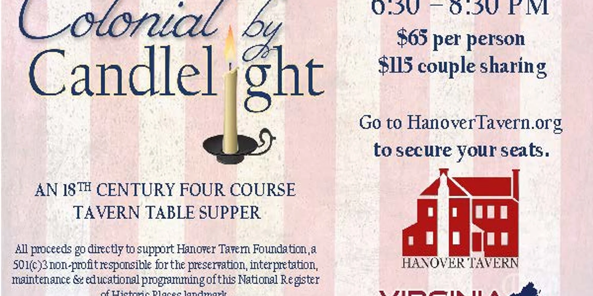 Step back in time at Hanover Tavern and savor an evening of old-world dining at Colonial by Candlelight, an 18th century Tavern Table Supper. By only the soft glow of flickering candles & lanterns, guests will begin the evening with an 18th century-era punch toast, then sit and enjoy 4 courses of thoughtfully prepared fare inspired by original recipes. Gracious hospitality and live music from the era will provide an atmosphere that feels worlds away from modern life—perfect for history lovers, romantics, and anyone seeking a truly unique dining experience. See the menu: Colonial by Candlelight Menu All proceeds go directly to support Hanover Tavern Foundation, a 501(c)3 non-profit responsible for the preservation, interpretation, maintenance & educational programming of this National Register of Historic Places landmark. $65/person or $115/couple sharing. Click here to secure your seats: Colonial by Candlelight Tavern Table Supper