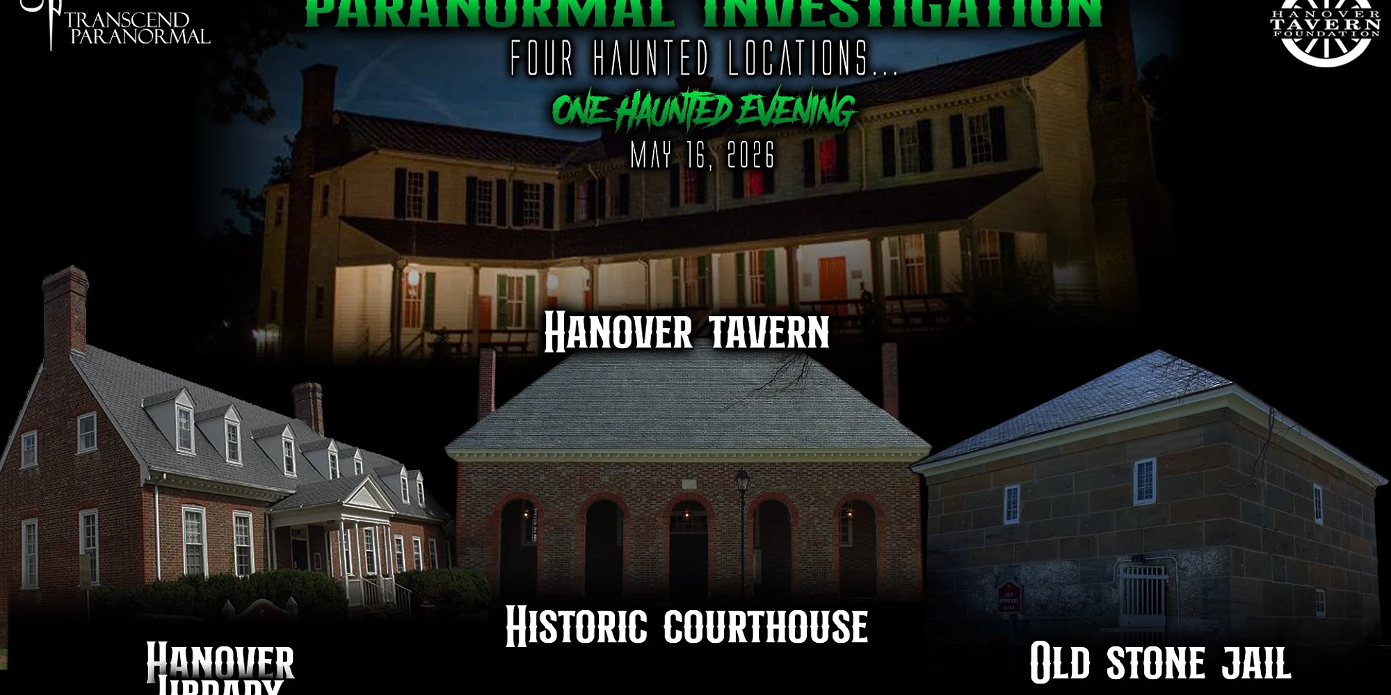 Join us May 16th to investigate not one, but FOUR locations in one night. The Hanover Tavern, the Old Stone Jail, the Historic Courthouse, and the Hanover Branch Library are all tied together in history; and now you’ll be able to investigate each of them. The Hanover Tavern: The earliest portion of the Tavern being built in 1791, there was a Tavern on the property spanning back to 1733. One of only a few surviving colonial-era Taverns in the United States, the Hanover Tavern hosted such historic figures as George Washington, Lord Cornwallis, Patrick Henry, P.T. Barnum, Marquis de Lafayette, and more. Both Union and Confederate troops utilized the Tavern on their way to and from the battlefields. The Old Stone Jail: Built in 1835, the Old Stone Jail was not a place you wanted to spend any time; criminals of all kinds were kept within these walls. The jail consists of 4 rooms; 2 cells occupy the lower floor, one cell on the upper floor, and one room that housed the jail’s warden and his men. It wasn’t until 1916 that glass windows were installed in the building. Prior to this, the only thing protecting inmates indoors from the cold, harsh winters outdoors were iron bars. The Historic Courthouse: The Third-longest continuous-use courthouse in the United States sits here in Hanover County; the Historic Hanover Courthouse. Built in 1735, the courthouse saw countless cases. Most significantly, this Courthouse played host to Patrick Henry when he argued the Parsons’ Cause case – a spark of the American Revolution. Many troops passed by the Courthouse – both during the Revolutionary War and Civil War. Sustaining mild damage during the American Revolution, the courthouse was repaired in time to see further conflict during the Civil War. The Battle of Hanover Courthouse brought heavy skirmishes to the area on May 27, 1862, and when the Union forces returned to the Courthouse at the end of May 1864, they imprisoned Hanover County’s Clerk of Court. The Hanover Branch Library: Built in the 1940’s, the Hanover Branch Library resides on land once part of the Hanover Tavern property. Directly at it’s back door lies the Thilman Burial Grounds, where previous Tavern owners and family were laid to rest. Build directly across the street from the Old Stone Jail, the Hanover Branch Library rests on hundreds of years of history. For years, guests of each of these locations report eerie experiences of ghost apparitions, smells, and un-explainable noises. For the first time ever, we have access to investigate those claims. Are previous Hanover Tavern keepers still roaming the halls? Are inmates still inhabiting the cells of the Old Stone Jail? Or are court cases still being played out to this day in the Historic Courthouse? It’s time to find out for yourself. We have investigated all of these locations numerous times and have come away with proof of the paranormal on every visit. Guests of these locations often report eerie experiences of ghostly apparitions, smell...
