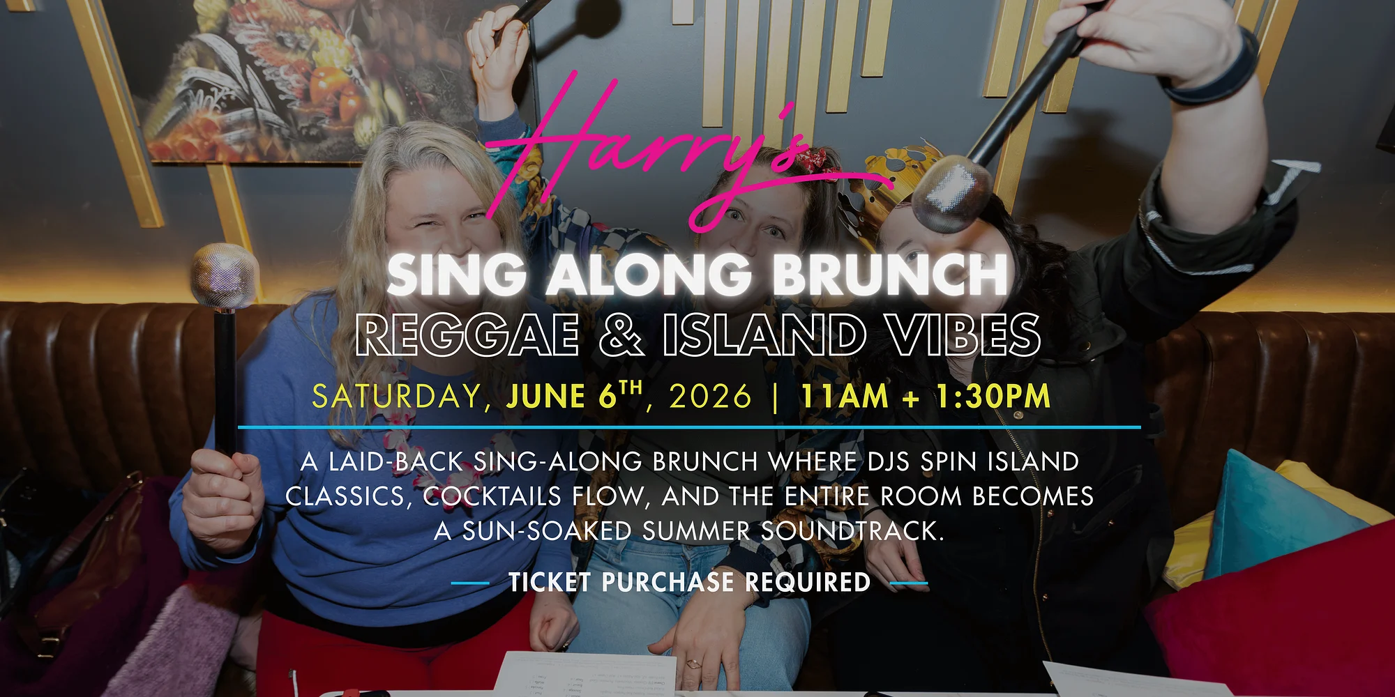 A high-energy sing-along brunch where DJs spin throwback hits, mimosas flow, and the entire room becomes the show. Summer kicks off with laid-back island rhythms and reggae classics that instantly put everyone in a good mood. Harry’s turns brunch into a sunny sing-along packed with feel-good beach vibes. Expect reggae favorites everyone knows by heart, a room full of guests singing together, and a relaxed, upbeat atmosphere that makes brunch feel like a summer party. DJ Chuck T keeps the island grooves flowing while guests sing along, sip cocktails, and enjoy brunch favorites from the Harry’s menu—with fun props like microphones, sunglasses, and more available as part of the experience. 🍳 Brunch Menu: Harry’s full brunch menu will be available during the event. 🎟 Ticket Price: $15 Includes entry, live DJ performance, sing-along entertainment, themed props, and the full event experience. 🕚 Seating Times: • 11:00AM seating • 1:30PM seating (Each seating lasts approximately 2 hours) 🍸 Extended Party: The 2nd Floor Library Bar will be open from 1:00–4:00PM—perfect for guests arriving early to the 1:30PM seating or anyone looking to keep the party going after the 11:00AM brunch. 👗 Attire: Bright colors, tropical prints, beachwear, and island vibes encouraged. 💳 Gratuity Notice: An automatic 20% gratuity will be added to all checks. Seats are limited—book early and kick off summer with a tropical sing-along brunch. 🌴🎶 Book Now
