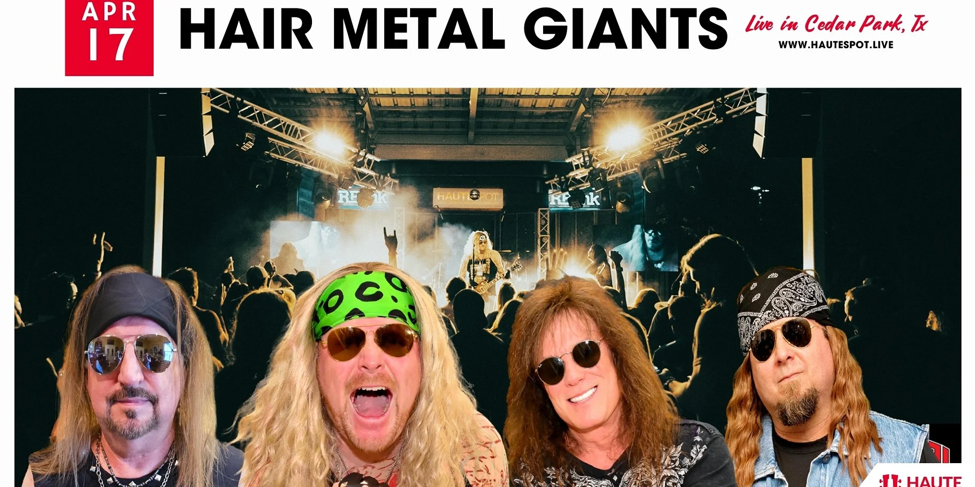 HAIR METAL GIANTS Live at Haute Spot Get Tickets We’re thrilled to welcome Hair Metal Giants at Haute Spot in Cedar Park, Tx on Friday, April 17th, 2026! EVENT DETAILS DATE: Show Date: Friday, April 17th, 2026 TIME: Doors at 6:00 PM | Happy Hour until 7:00 PM SUPPORT: TBA LOCATION: Haute Spot - 1501 E New Hope Dr. Cedar Park, Tx 78641 *Times Subject to Change About Haute Spot: Haute Spot is Cedar Park's premier outdoor music venue - along with heaters, food, drinks and live music under the stars! Limited Tables and Seats available - so act fast! Tables come with food and drink delivery service as well through our QR codes. get tickets See all upcoming Haute Spot shows here.