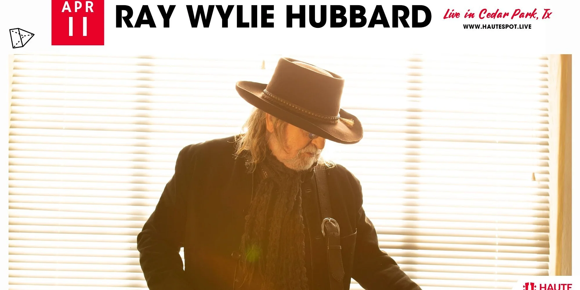 Ray Wylie Hubbard Live at Haute Spot Get Tickets We’re thrilled to welcome Ray Wyle Hubbard at Haute Spot in Cedar Park, Tx on Saturday, April 11th, 2026! EVENT DETAILS DATE: Show Date: Saturday, April 11th, 2026 TIME: Doors at 6:00 PM | Happy Hour until 7:00 PM SUPPORT: TBA LOCATION: Haute Spot - 1501 E New Hope Dr. Cedar Park, Tx 78641 *Times Subject to Change About Haute Spot: Haute Spot is Cedar Park's premier outdoor music venue - along with heaters, food, drinks and live music under the stars! Limited Tables and Seats available - so act fast! Tables come with food and drink delivery service as well through our QR codes. get tickets See all upcoming Haute Spot shows here.