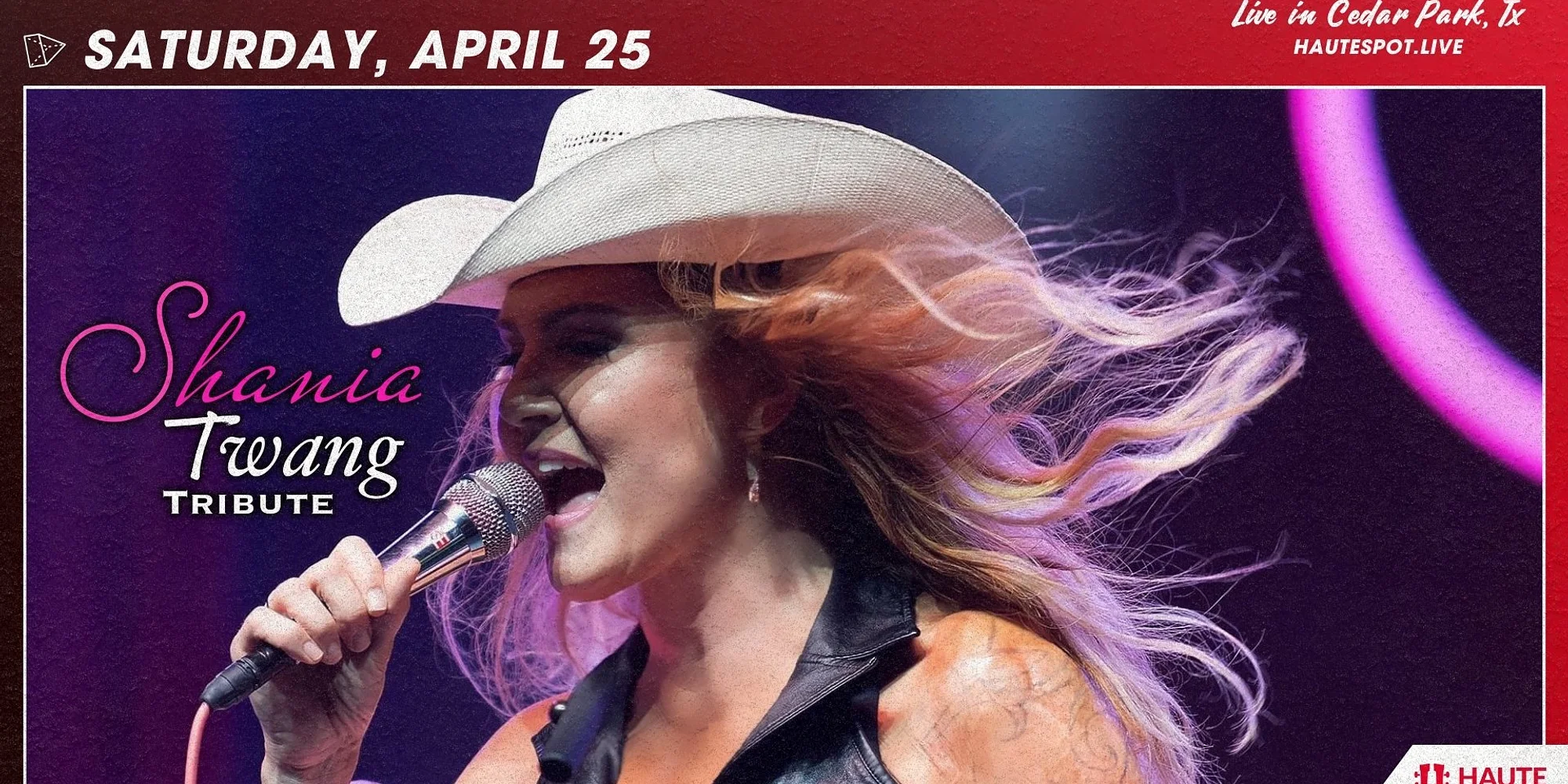 Shania Twang (Shania Tribute) Live at Haute Spot Get Tickets We’re thrilled to welcome Shania Twang (Shania Tribute) at Haute Spot in Cedar Park, Tx on Saturday, April 25th, 2026! EVENT DETAILS DATE: Show Date: Saturday, April 25th, 2026 TIME: Doors at 6:00 PM | Happy Hour until 7:00 PM SUPPORT: TBA LOCATION: Haute Spot - 1501 E New Hope Dr. Cedar Park, Tx 78641 *Times Subject to Change About Haute Spot: Haute Spot is Cedar Park's premier outdoor music venue - along with heaters, food, drinks and live music under the stars! Limited Tables and Seats available - so act fast! Tables come with food and drink delivery service as well through our QR codes. get tickets See all upcoming Haute Spot shows here.