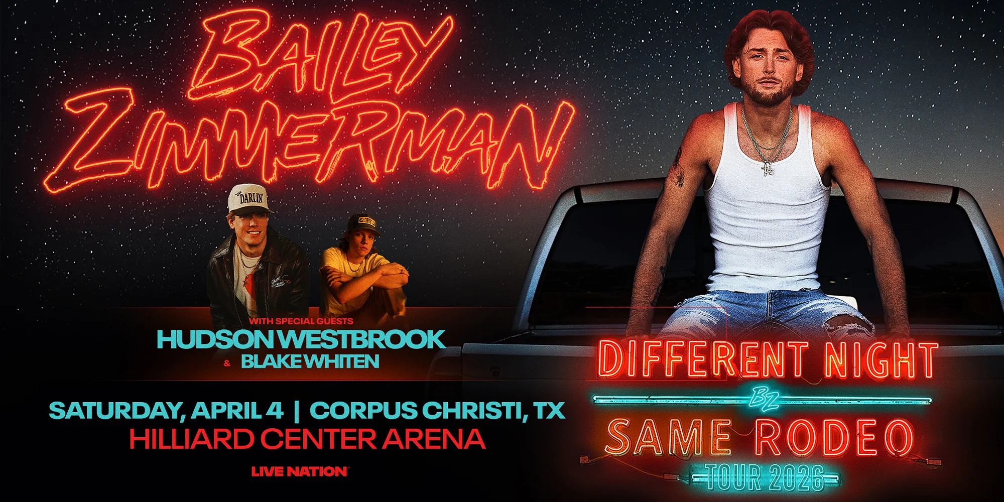 WHO: Bailey Zimmerman – Different Night Same Rodeo Tour 2026 WHAT: Chart-topping country artist Bailey Zimmerman is bringing his Different Night Same Rodeo Tour 2026 to the Coastal Bend for one night only. Fans can expect an unforgettable evening filled with Zimmerman’s biggest hits and high-energy performance. WHEN: Saturday, April 4, 2026 at 7:00 PM WHERE: Hilliard Center Arena Event Timeline Beer Garden: 4:00PM with Rasta Bob offering samples Doors: 6:00PM Show Time: 7:00PM Try our Speciality Drinks: Zimmermade and Rum and a Hard Place available at Beer Garden Bars, 3 Bars on 1st level including Texas Bar and Michelob Ultra Lounge Reserve Parking: tinyurl.com/ParkingatHilliardCenter Limited tickets still available: bit.ly/BaileyZimmermanCC Clear Bag Policy Credit Card Only