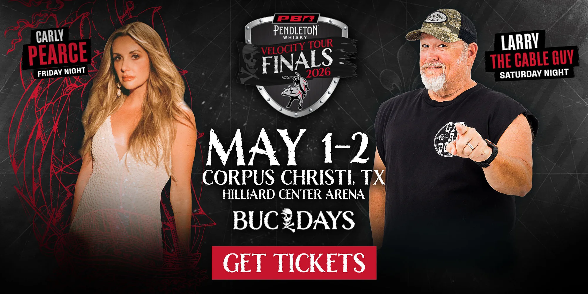 The PBR Pendleton Whisky Velocity Tour Finals return to Corpus Christi during Buc Days, taking over the Hilliard Center on May 1–2, 2026. Fans can experience two action-packed nights of elite bull riding as top PBR athletes compete for the Velocity Tour Championship and coveted spots in the PBR World Finals. The excitement continues beyond the arena with a live concert series featuring Grammy-winning country artist Carly Pearce on Friday, May 1, followed by a night of laughs with Larry the Cable Guy on Saturday, May 2. This high-energy event delivers a full Western sports and entertainment experience as part of the annual Buc Days celebration. Tickets are available now through Ticketmaster, BucDays.com, and PBR.com