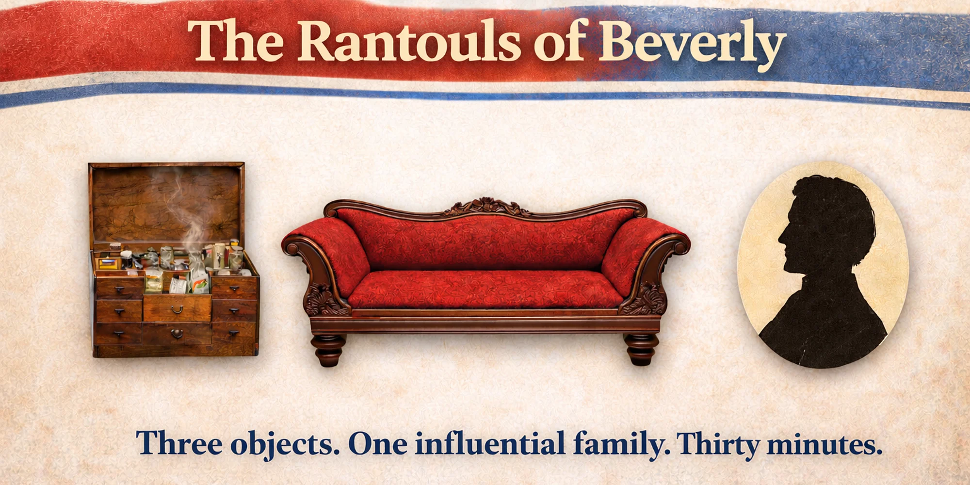 As Beverly celebrates Bev400 and Massachusetts marks MA250, this 30-minute, object-based program explores the Rantoul family’s impact on local and national history. Through three objects from the Historic Beverly collection, Squire Rantoul’s apothecary chest, Hannah Rantoul’s couch, and a silhouette of reformer Robert Rantoul Jr., discover how medicine, home life, and civic leadership shaped Beverly in the generations following the American Revolution. A fast-paced, engaging look at how everyday lives reflect revolutionary ideals.