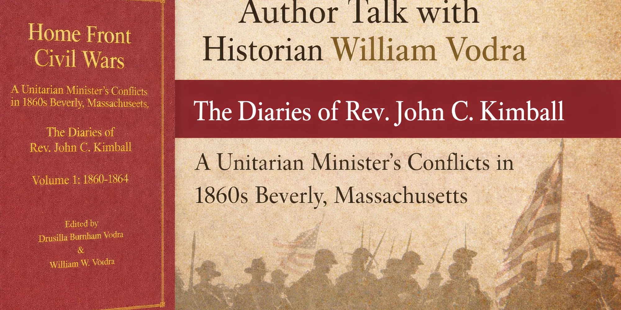 Join historian William Vodra for an author talk on Home Front Civil Wars: A Unitarian Minister’s Conflicts in 1860s Beverly, Massachusetts: The Diaries of Rev. John C. Kimball, Volume 1: 1860-1864 The Diaries of Rev. John C. Kimball, a compelling two-volume work that brings to life the turbulent social, political, and religious world of Civil War–era Beverly, Massachusetts. Through the writings of Unitarian minister John C. Kimball (1832–1910), a progressive reformer and outspoken abolitionist, the diaries reveal the challenges of leading a congregation during one of the nation’s most divisive periods. Educated at Amherst College and Harvard Divinity School, Kimball championed emancipation, women’s rights, workers’ rights, and freedom of thought, often placing him at odds with more conservative members of his community and denomination. His memoir-style diaries document daily life on the home front, debates over slavery and faith, his service as chaplain of the 8th Massachusetts Infantry during the Civil War, and the personal and public conflicts that ultimately led to his departure from Beverly in 1870. Vodra will discuss the process of editing and interpreting these richly detailed writings, which blend sermons, letters, travel accounts, and vivid observations of nineteenth-century life, offering a rare window into how national crises shaped one New England community and one minister’s conscience. Books will be for sale and Mr. Vodra will be on hand after the program to sign the books.