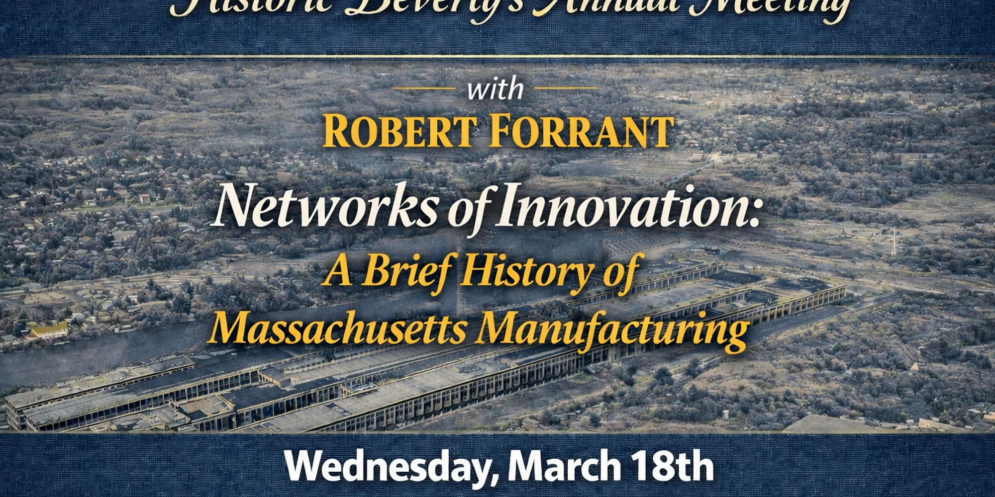 Historic Beverly Annual Meeting Join us for an evening of community, conversation, and history at Historic Beverly’s Annual Meeting. Free and open to the public! Schedule 6:00 PM Doors Open & Refreshments 6:15 PM Annual Business Meeting 7:00 PM Featured Program: Networks of Innovation: A Brief History of Massachusetts Manufacturing Light refreshments will be available. Featured Talk Networks of Innovation: A Brief History of Massachusetts Manufacturing Horace Mann observed in 1845, “The people of Massachusetts, to a greater extent than those of any other State in the Union, are a mechanical people.” Across the Commonwealth, networks of manufacturers were as innovative and entrepreneurial as today’s firms in Silicon Valley and along Routes 128 and 495. In this engaging talk, University of Massachusetts Lowell Professor Robert Forrant explores the history of this culture of creativity, with particular attention to the region’s machinery builders and the broader industrial ecosystems that shaped Massachusetts and the nation. About the Speaker Robert Forrant is Distinguished University Professor of History at the University of Massachusetts Lowell. He is the author of ten books and has served as principal historian on numerous projects funded by the National Endowment for the Humanities and the Massachusetts Foundation for the Humanities. His newest book, co-edited with Mary Anne Trasciatti, Where Are the Workers: Interpreting Labor and Working-Class History at Museums and Historic Sites, was published by the University of Illinois Press in 2022. Before entering academia, Forrant spent nearly fifteen years as a machinist at the American Bosch Company in Springfield, Massachusetts, experience that deeply informs his scholarship on labor and industrial history.