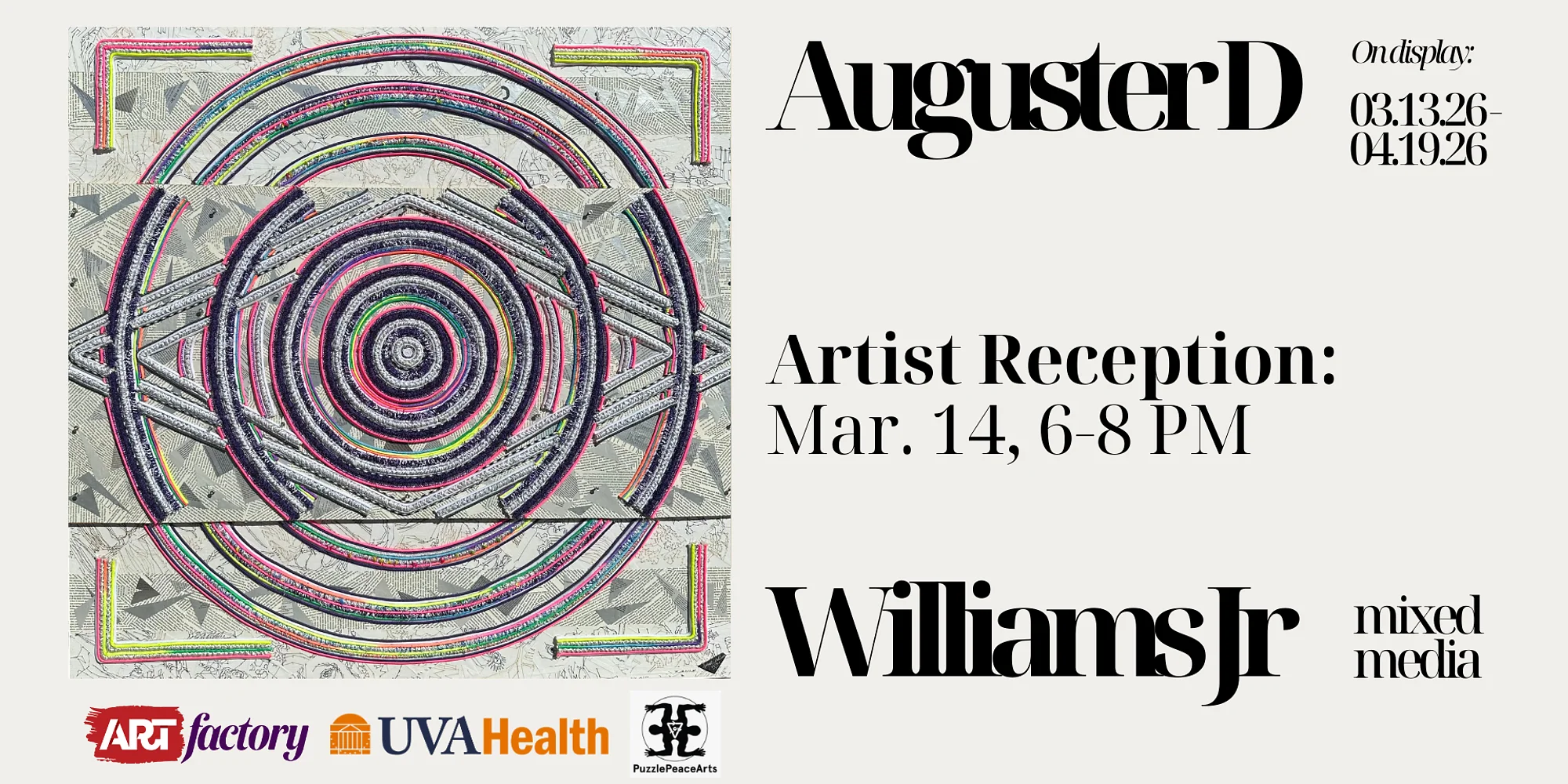 On display: March 13, 2026 – April 19, 2026ARTfactory, 9419 Battle St, Manassas, VA Opening Reception: Saturday, March 14, 2026, 6–8 PM Artist Talk: Saturday, April 11, 2026, 2-4 PM Exhibition programming sponsored by UVA Health. In this solo exhibition, mixed-media collage artist Auguster D Williams Jr presents a compelling body of two- and three-dimensional works created from discarded and salvaged materials. Drawing from wood, glass, cardboard, metal, plastic, and textiles—often recovered from dumpsters or curbside castoffs, the exhibition explores themes of resilience, healing, and transformation through richly layered, evocative compositions. Rooted in sustainability and personal renewal, Williams’s practice reimagines overlooked materials into cohesive works that blur the boundaries between fine art and functional design. Mirrors, room dividers, connectors, and windmills appear alongside wall-based collages, challenging traditional notions of utility while emphasizing the poetic potential of reuse. The artist’s creative journey began in 2017 while participating in art therapy through the U.S. Department of Veterans Affairs’ substance abuse and mental health program. A U.S. Navy veteran living with PTSD, Williams discovered art as both a therapeutic outlet and a powerful form of selfexpression. In 2018, the collage Love (Thyself) and Resilience received First Place in its category at the National Veterans Creative Arts Festival—an achievement that marked a pivotal moment and solidified a lifelong commitment to artistic practice. Since then, Williams has exhibited work in Washington, D.C. and New York, continuing to expand a portfolio that centers on repurposing—not only of physical materials, but of personal identity. Often describing themselves as a “repurposed human being,” the artist transforms what was once discarded into objects of meaning and beauty, offering a broader reflection on recovery and the resilience of the human spirit. Williams’s solo exhibit ultimately encourages audiences to recognize beauty in the unexpected and to consider creative engagement as a powerful path toward wellness, connection, and community. Press Inquiries: Jordan Exum, Gallery Director ARTfactory | Caton Merchant Gallery 703.330.2787 | jexum@virginiaARTfactory.org Home Gallery hours: Tuesday-Saturday, 10 am-5 pm, Sunday, 12-5 pm