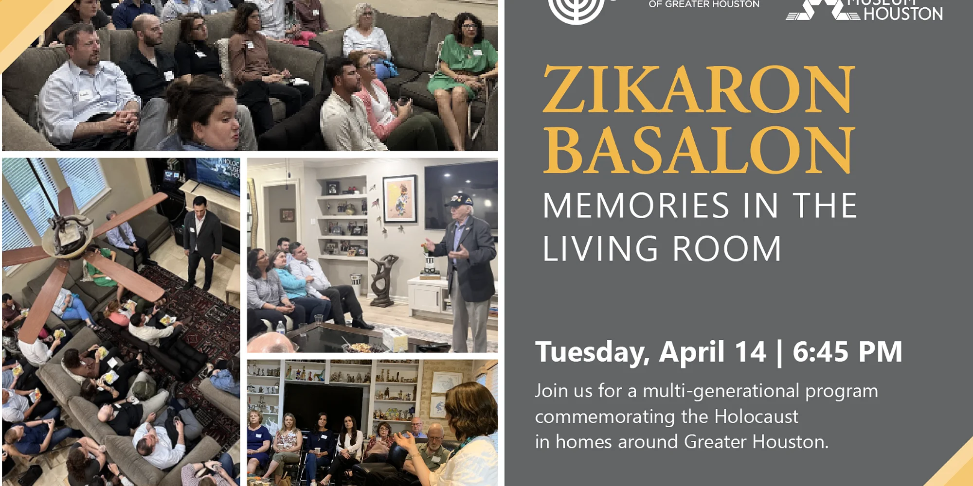 Zikaron BaSalon, “Memories in a Living Room”, began in Israel in 2011 and has grown into a global movement. Houston’s Jewish community has been part of Zikaron BaSalon since 2017. Since then, each year on Holocaust Remembrance Day, people open their homes to small gatherings where Holocaust survivors or their descendants share personal testimony in an intimate, respectful setting. Join us for this multi-generational program commemorating the Holocaust in homes around Greater Houston. Registration is now closed.