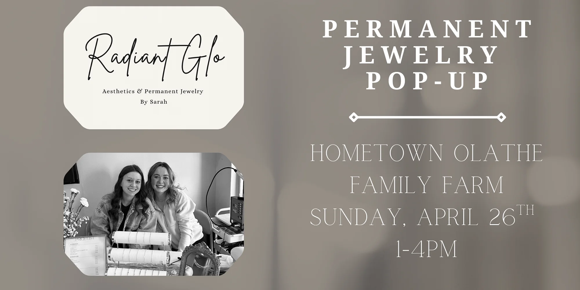 Join us for a beautiful afternoon with Radiant Glo., where you’ll find jewelry that’s as effortless as it is lasting. From custom-fit, clasp-free permanent pieces to handmade, tarnish-resistant, hypoallergenic styles you can take off (if you must 😉), every piece is designed to be meaningful, dainty, and low-maintenance—just like your ideal accessory should be. 🔗 Get linked with permanent jewelry on-site 💎 Shop ready-to-wear favorites 🥤 Enjoy cocktails + mocktails while you browse 👯♀️ Bring your girls for the ultimate day out 📍 11000 S Woodland St, Olathe, KS Whether you're celebrating something special or just want to shine a little brighter, this is your moment to sparkle. ✨ 🕒 Hours: Monday-Thursday: Closed Friday: 12PM – 12AM Saturday: 12PM – 10PM Sunday: 11AM – 6PM See more events at hometownolathefamilyfarms.com!