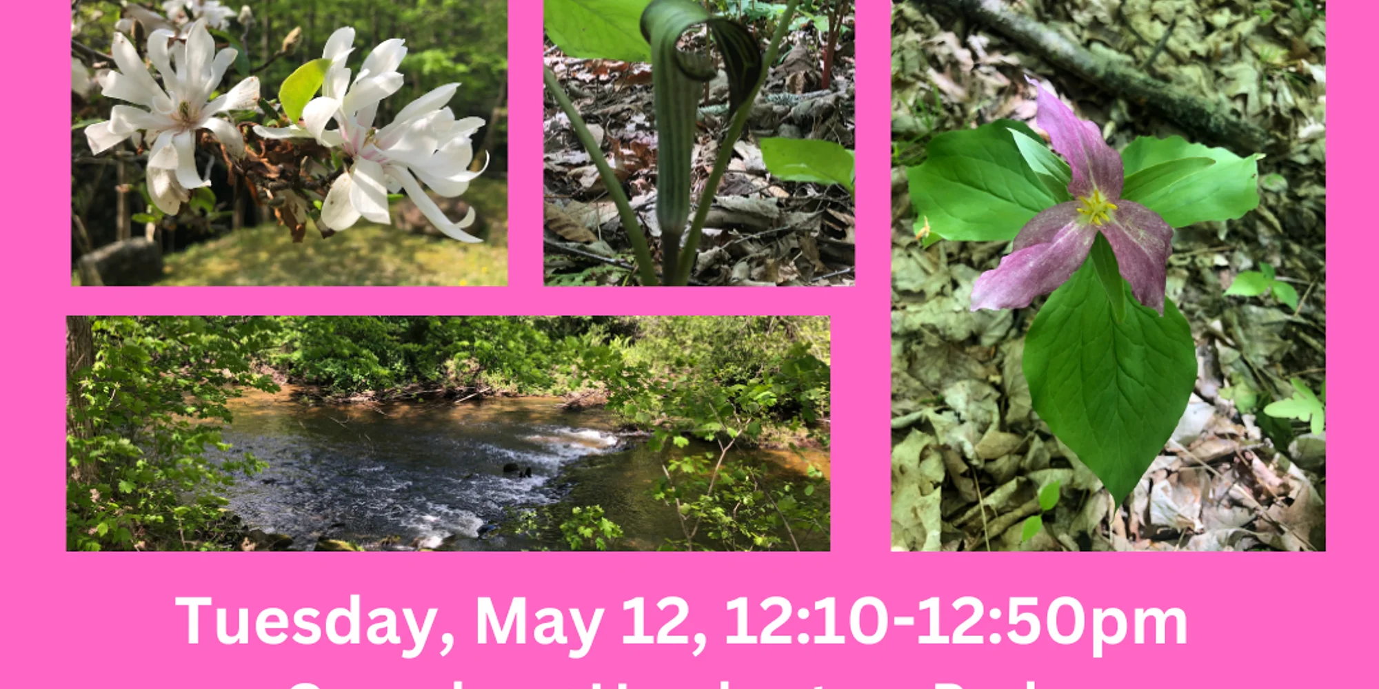 Take a wellness break during your lunchtime and enjoy the spring wildflowers with naturalist educator Arianna Collins. Learn about spring ephemerals and get your steps in on Tuesday, May 12 from 12:10-12:50pm. Meet at Greenberg Headwaters Park Trailhead on Belvidere Street, Bennington VT. No registration necessary. Just show up if you can. This event is brought to you by the Hoosic River Watershed Association (HooRWA), Anytime Fitness, Heritage Family Credit Union, the Town of Bennington, and the Vermont Land Trust.