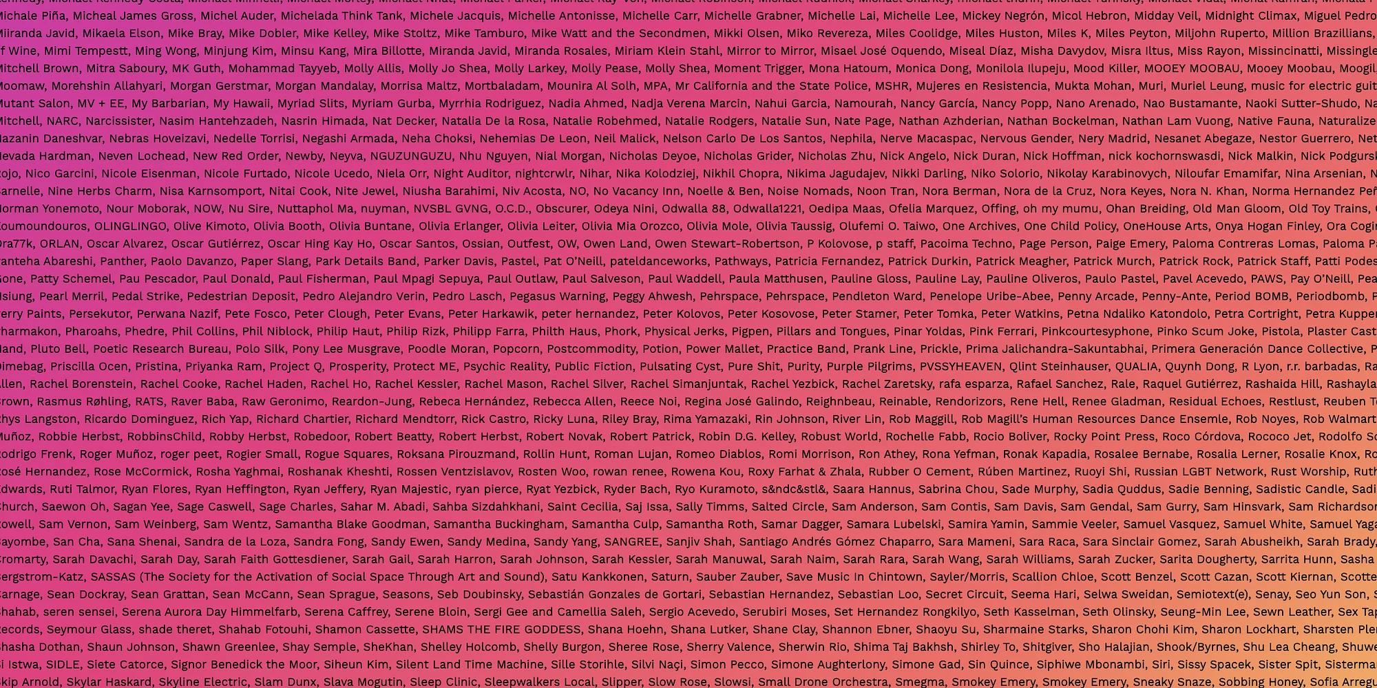 $3.33, _____ Daniel, (de) Color-Es, (Same), #HealHer, #Not1More, #SNATCHPOWER, +Dog+, 0ll668, 75 dollar bill, A.B.S., A.K. Burns, A.L. Steiner, A$AP Bari, Aaron Drake, Aaron M. Olson, Aaron Meyers, Aaron Turner, Aaron Wrinkle, Aarum Alatorre, Abby Cunnane, Abby Findley, Abdul Hamid Royal, Abe Holllow, Abe Vigoda, Abhora, Abigail Bouchet, Abigail Levine, ABJECTFAILUREEXHRISTDCVR, Abraham Ávila, Abraham Gonzáles Pacheco, Acacia Marable, Ace Farren Ford, Ace Ford Ferren and the Artificial Art Ensemble, ACP (Artists Curated Projects), Actuary, Ada Navarro, Ada Tinnell, Adam James, Adam Keith, Adam Khalil, Adam Laiben, Adam O, Adam Valentin Villanueva, Adam Willetts, Adee Roberson, Adie San Diego, Adrian Abela, Adrian Culverson, Adrienne Walser, Afia Fields, Africa Avila, AFTA, After Hours, AFTERBURNER, Ago Visconti, Ahram Park, Aidan Reynolds, Aidan Reynolds, Aimee Bender, Aimee Goguen, AirChina, Ajani Brannum, Aki Onda, Alan Chan, Alan Danielson, Alan Ishi, Alan Najagawa, Alan Poma, Alan S. Tofighi, Alan Tollefson, Alana Reibstein, Albert Samreth, Albert Serna, Alberto Lule, Alee Peoples, Alee Peoples, Alejandra Herrera, Alejandro Figueredo Diaz-Perera, Alex Anderson, Alex Avila, Alex Black, Alex Brown, Alex Chaves, Alex Delapena, Alex Hawthorn, Alex Kerr, Alex Lilly, Alex Michel, Alex Pelly, Alex Romania, Alex Sanchez, Alex Staiger, Alex the Brown, Alex Twomey, Alexa Weir, Alexander Borinsky, Alexander Kluge, Alexander Kroll, Alexander Stewart, Alexander Zevin, Alexandra Noel, Alexandre Dorriz, Alexandria Douziech, Alexei Shulgin, Alexis Disselkoen, Alez Zhang Hungtai, Alfredo Gonzalez Reynoso, Ali Eyal, Ali Liebegott, Alice Cunt, Alice Sparkly Kat, Alice Wang, Alice Yuan Zhang, Alicia Piller, Alima Lee, Alina Tenser, Alisa Cacho-Sousa, Alise Spinelle, Alison D’Amato, Alison O’Daniel, Alison Zukovsky, Alisson Schmitt, Aliza Schvarts, all your sisters, Allangelsonline, Allen Bleyle, Allen Hung-Lun Chen, Allie Miks, Allison Miller, Allison Parrish, Allison Wyper, Allyson Jeffredo, Aloonaluna, Alphabet Of Wrongdoing, Alpine Decline, Alsea Diana, ALTO!, Alvi Haapamäki, Alyse Emdur, Alyssa Rogers, Amanda Ackerman, Amanda Bonaiuto, Amanda Faye Jimenez, Amanda Horowitz, Amanda Joy, Amanda Marsalis, Amanda Siegel, Amanda Yates, Amanda-Faye Jimenez, Amara Gyulai, Amara Higuera, Amazondotcom, Ambient DJ, Amelia Bande, Amelia Jones, American Artist, American Studies Association, Amia Yokoyama, Amir Says Nothing, Amitis Motevalli, Ampersan, Amps for Christ, AMRA, Amy Chiao, Amy Golden, Amy Howden-Chapman, Amy Mackay, Amy Sampson, Amy Sánchez-Arteaga, Ana Andrade, Ana Iwataki, Ana Teo Ala-Ruona, Anais Hinojosa, Anastasia Denos, Anatommy, ANDORKAPPEN, Andre Keichian, Andrea Abi-Karam, Andrea Lambert, Andrea Longacre-White, Andrea Medina, Andrea Nhuch, Andrea Ordaz, Andrea Soto, Andrea Steves, Andrei Jay, Andrés Grillo, Andrew Becerra, Andrew Benson, Andrew Berardini, Andrew Choate, Andrew Cox, Andrew Disorder, Andrew Gura, Andrew Kim, Andrew Norman Wilson, Andre...