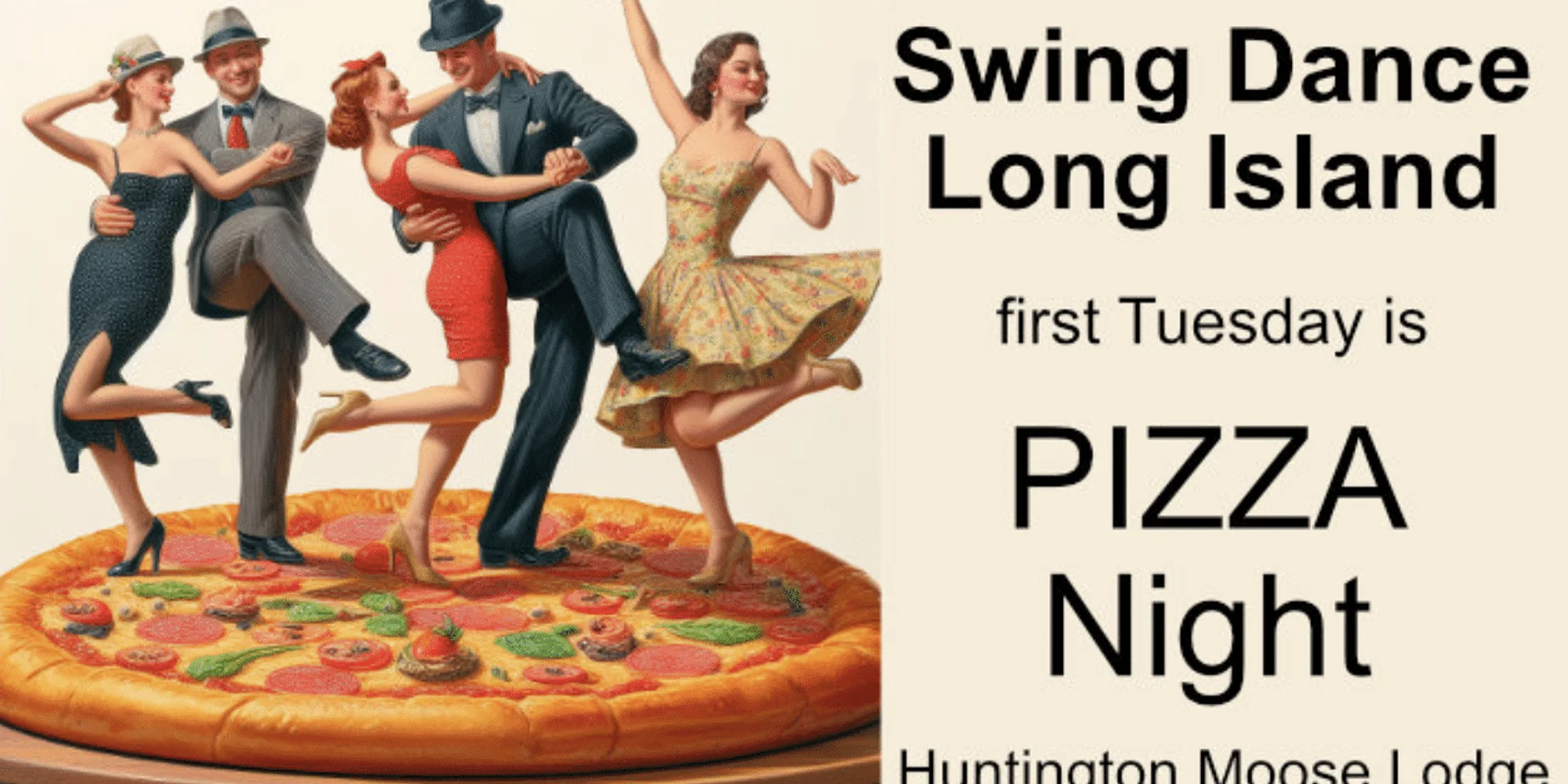 Pizza will be served at Swing Dance Long Island’s Tuesday dance on the first Tuesday of each month at the Huntington Moose Lodge in Greenlawn. Lesson at 7:30PM and social swing dancing at 8PM. No partner is necessary and beginners are welcome. $10 for SDLI members and students, $15 for non-SDLI members. Please check the website: https://www.sdli.org for the latest information.