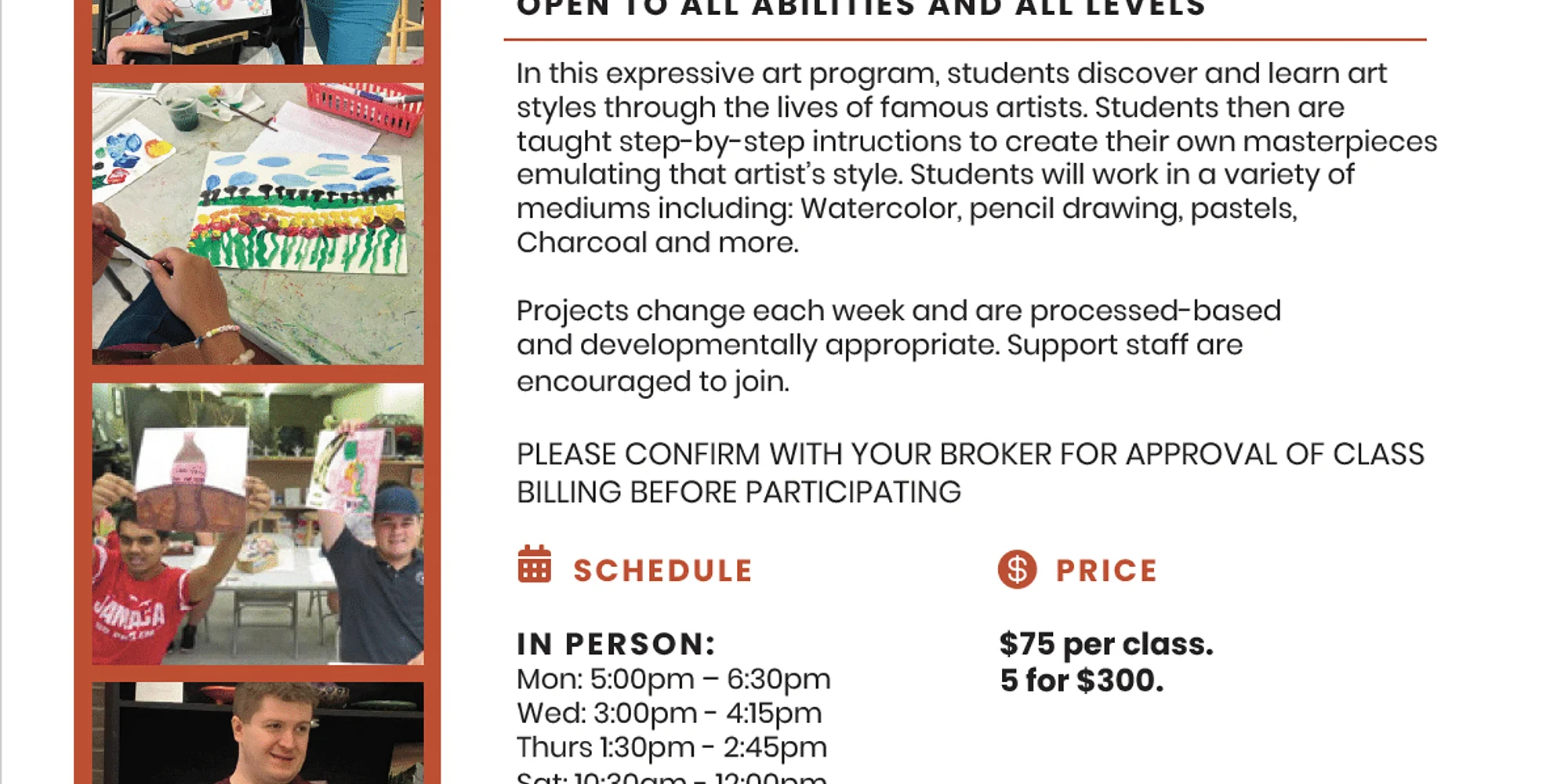 This expressive art program invites students to explore art through both learning and doing. Each session begins with a brief, engaging introduction to a featured artist and their work. Students then create their own art using guided techniques and a range of materials—including watercolor, pencil, pastels, and charcoal—while focusing on self-expression, creativity, and confidence rather than perfection. Our art classes are open to all abilities, all ages, and all levels of experience! IN PERSON CLASSES Mondays: 5:00pm-6:30pm Wednesdays: 3:00pm-4:15pm Thursdays: 1:30pm-2:45pm Saturdays: 10:30am-12:00pm VIRTUAL CLASSES (Join us on Zoom!) Saturdays: 12:30pm-1:30pm PRICE $75 per class or 5 for $300 Please call Michael D at 631-533-9639 for more info!