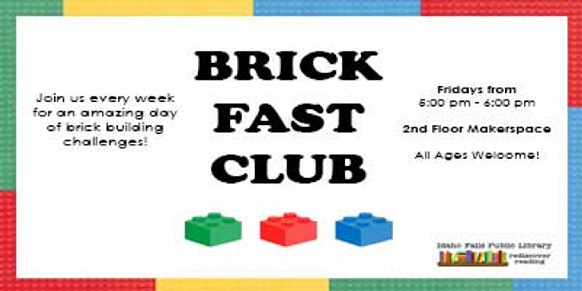 All ages are welcome to join the Idaho Falls Public Library’s self-directed Brickfast Club. Come every Friday for an amazing day of imagination and construction at your local Library Makerspace. Pack up your creativity and let’s construct some magic. Each month holds a different challenge. April 2026: Time Traveler’s Tales Step into the time machine and build scenes from different eras of history. Whether it’s the age of dinosaurs, the medieval period, or a futuristic society, let your Lego creations tell stories across time. With Brickfast Club, you can: Meet and collaborate with fellow LEGO enthusiasts in your community. Explore the endless possibilities of LEGO bricks and take part in engaging, hands-on learning. Ignite your imagination with our fun monthly challenges that will keep you coming back. LEGO Day at your Library Makerspace is the perfect place to be inspired, learn, and create while having a fantastic time. Let’s make something incredible, brick by brick. See you there! For more information, send us a message or call 208-612-8460.
