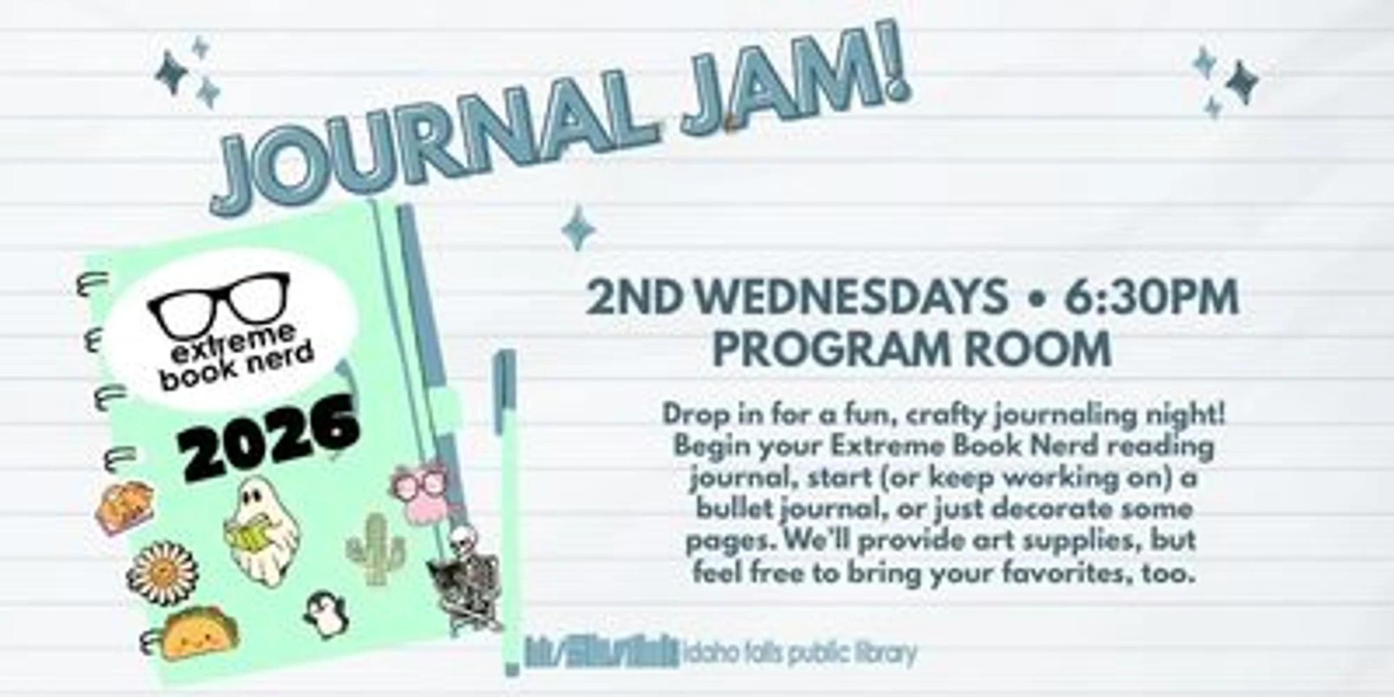 Come to the Idaho Falls Public Library for a Journal Jam! At 6:30pm on the 2nd Wednesdays of the month, drop in for a fun, crafty journaling night! Work on your Extreme Book Nerd reading journal or any journal of your choice. Some art supplies will be provided, but feel free to bring your favorites, too. For more information about this program and others that are hosted by the Idaho Falls Public Library, send us a message or call 208-612-8460.