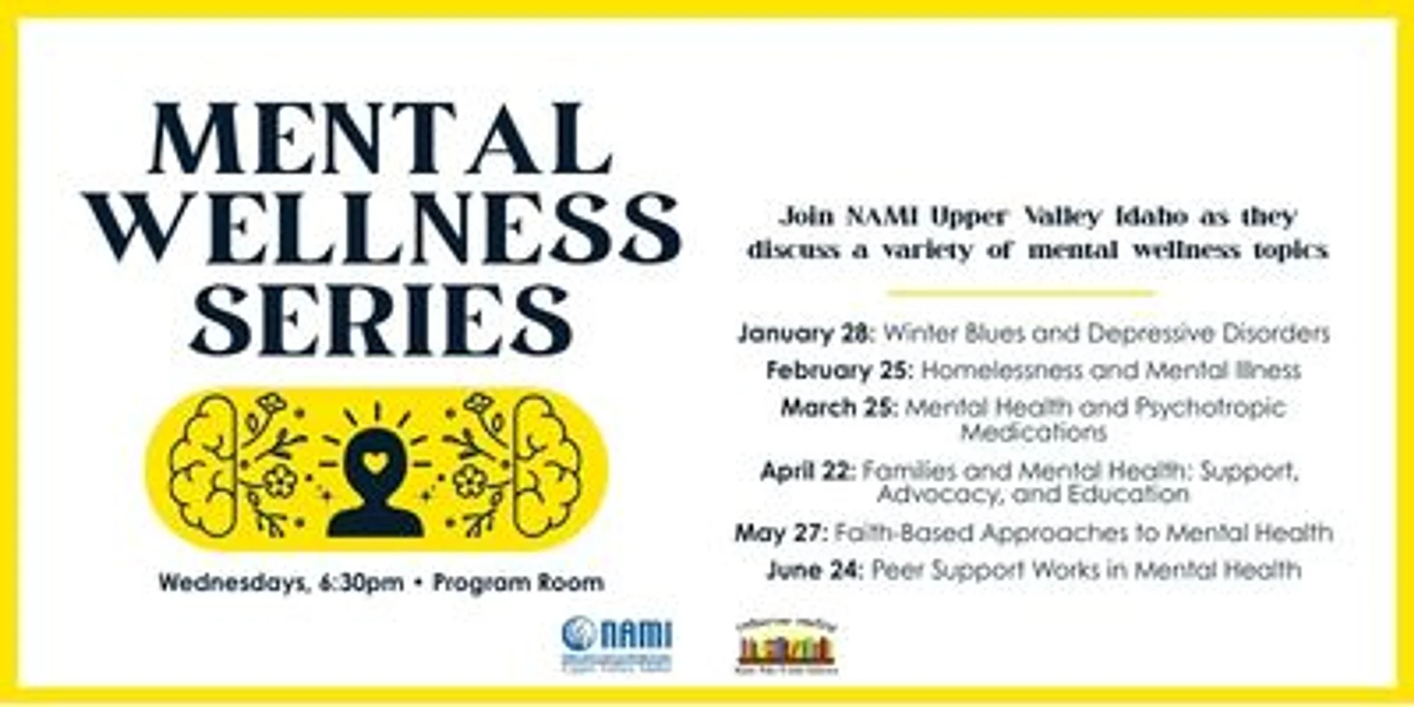 Join National Alliance on Mental Health (NAMI) Upper Valley Idaho as they discuss a variety of mental wellness topics. This new program starts January 28th and will run Wednesdays at 6:30 in the Program Room. January 28 – Winter Blues & Depressive Disorders February 25 – Homelessness and Mental Illness March 25 – Mental Health and Psychotropic Medications April 22 – Families and Mental Health: Support, Advocacy, and Education May 27 – Faith-Based Approaches to Mental Health June 24 – Peer Support Works in Mental Health For more information about this event, send us a message or call 208-612-8460.
