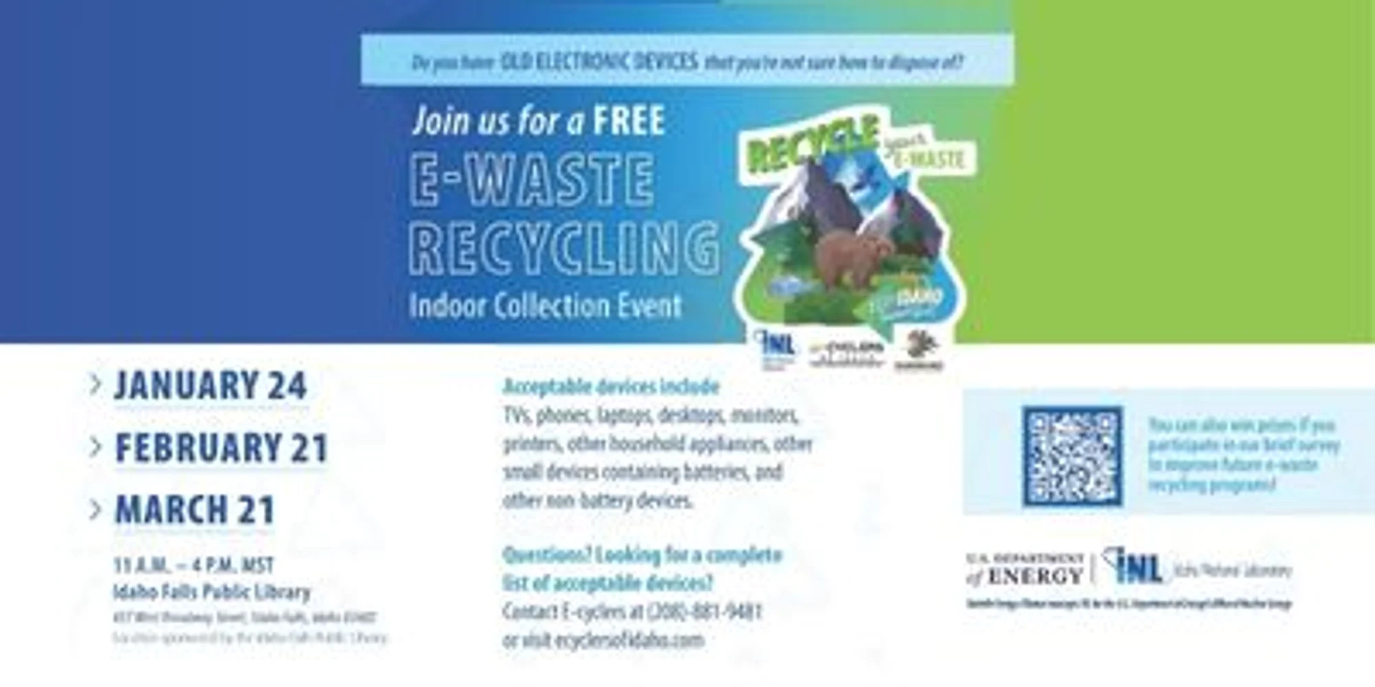 Don’t know how to dispose of old electronic devices? Join the Idaho Falls public library and e-Cyclers of Idaho for an e-waste recycling event from 11 a.m. to 4 p.m. on Saturday, March 21st at the Idaho Falls Public Library. Drop off old and unused electronics for recycling! For a list of accepted items, please visit https://ecyclersofidaho.com.