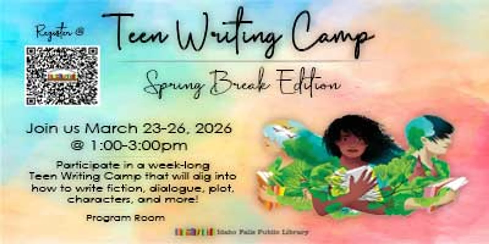 Teens, come join us March 23-26, 2026 from 1:00-3:00pm in the 2nd Floor Program Room! Participate in a week-long Teen Writing Camp that will dig into how to write fiction, dialogue, plot, characters, and more! Register using this Google Form. For more information, send us a message online or call 208-612-8460.