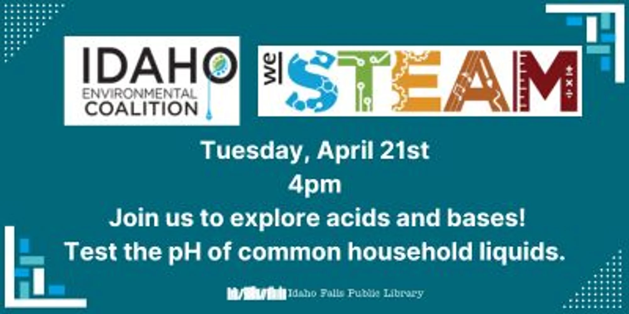 On Tuesday, April 21st at 4pm, join us to explore acids and bases with the Idaho Environmental Coalition and We STEAM. Test the pH of common household liquids. For more information, send us a message or call 208-612-8460.
