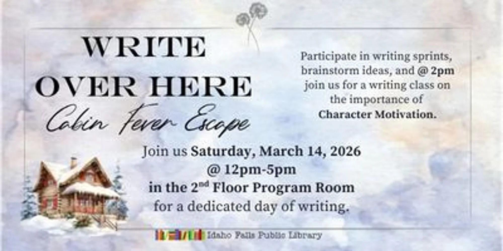 Join the Idaho Falls Public Library in the 2nd Floor Program Room on March 14 from 12pm to 5pm for a dedicated day of writing with Cabin Fever Escape! Participate in writing sprints, brainstorm ideas. At 2pm, join us for a writing class on the importance of Character Motivation. For more information, send us a message online or call 208-612-8460.