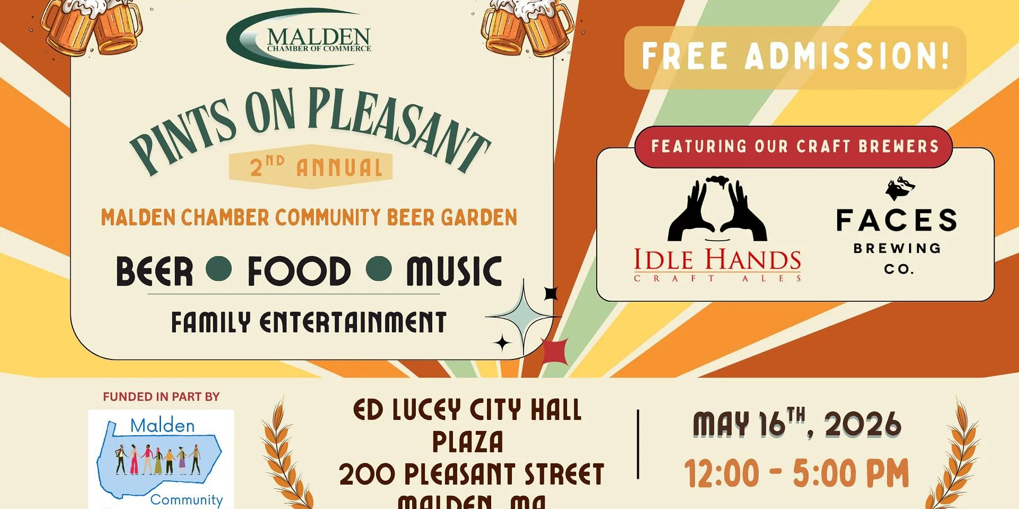 Pints on Pleasant – 2nd Annual Community Beer Garden Join the Malden Chamber of Commerce for an afternoon of community, connection, and celebration at our 2nd Annual Pints on Pleasant! Bring your friends, family, and neighbors and enjoy a lively, family-friendly festival right in the heart of Malden. FREE ADMISSION – All Are Welcome! Ed Lucey City Hall Plaza Saturday, May 16, 2026 12:00 PM – 5:00 PM What to Expect: Local craft beer from featured brewers Local Food Trucks Live music throughout the day Family-friendly entertainment and activities Featuring craft brews from: Idle Hands Craft Ales Faces Brewing Co. This is your chance to: Connect with the local business community Support Malden’s amazing breweries and vendors Enjoy a fun, relaxed afternoon with family and friends Let us know you're coming! Click “Going”, invite your friends, and help us spread the word. The more, the merrier! We can’t wait to see you there for one of Malden’s favorite community events of the year!