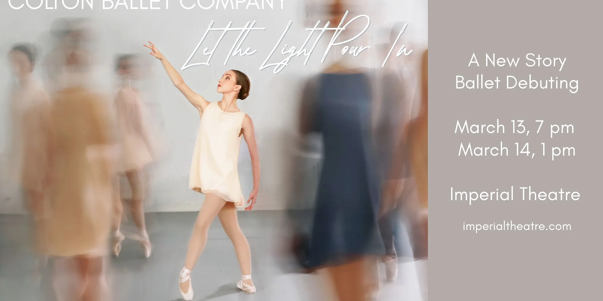 Colton Ballet presents Let the Light Pour In March 13th, 7pm March 14th, 1pm Let the Light Pour In is a new full-length story ballet inspired by the poetry of Lemn Sissay, presented by Colton Ballet Company and choreographed by Artistic Director, Caitlin Phibbs. This nature-filled production follows a Child, Light (the Sun), and Dark (the Moon) through a single day as they meet birds, wildflowers, moths, lightning bugs, and more. Blending lyrical poetry and expressive dance, this ballet celebrates wonder, balance, and the quiet power of hope. A heartfelt work for audiences of all ages. TICKETS HERE!