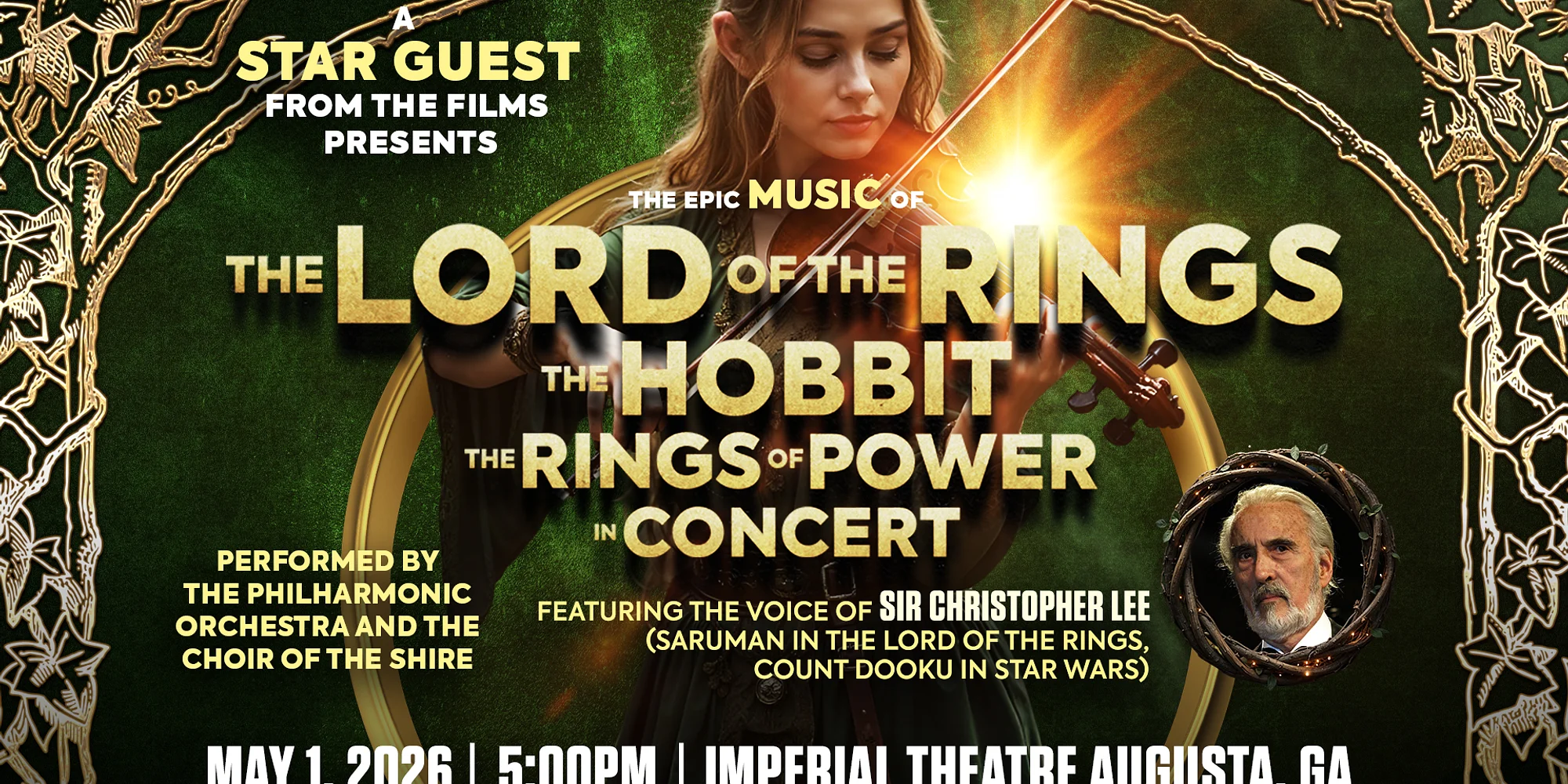RESCHEDULED TO MAY 1ST, 2026 AT 5PM! Experience , & in Concert – presented by a star guest from the films! Enjoy the unique music worlds of J.R.R. Tolkien in a magnificent concert featuring world-class star soloists, the voice of legendary Saruman actor Sir Christopher Lee, and the Orchestra and Choir of the Shire: From the menacing sounds of Mordor and shrill attacks of the Black Riders to the beautiful, lyrical melodies of the Elves. Enjoy the only film music concert series in the world with a star guest from the Lord of The Rings & Hobbit films, who will not only present the best music from “The Lord of the Rings, The Hobbit & The Rings of Power – The Concert”, but also be available for a free picture with you if you buy your tickets today! The Lord of the Rings, The Hobbit, and The Rings of Power are trademarks of their respective owners. This concert is an independent event and is not affiliated with or endorsed by the studios, production companies, or respective trademark owners. tickets here!