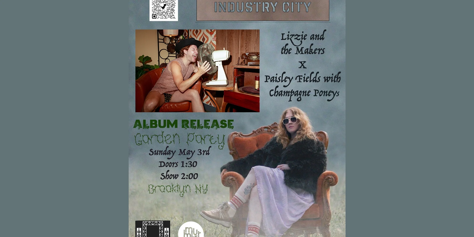 Tickets: https://wl.eventim.us/Getitrightthefirsttime Each ticket purchase includes 12-ounce beer, 7 ounce wine, well cocktail or Non-alcoholic beverage. Additional beverages can be purchased for reasonable prices! EVENT INFO Album Release Garden Party (but make it weird): “Are U Mad At Me” x “Everything’s Fine” Paisley Fields and Lizzie and the Makers are throwing it down to celebrate the May release of their new albums. Live sets, red carpet, free flash tats and a drink with your ticket, DIY hat chaos, local art sales, and all the spring sun you can handle (rain or shine). Outdoor. Unhinged. Fun guaranteed. Come weird. Come loud. Come ready. Cash bar with themed cocktails. Champagne Poneys kick things off at 2pm! Event Info Date: May 3, 2026 Doors: 1:30pm Showtime:2:00pm End time (sorry): 6:00pm Address: Industry City Bandshell Stage, Courtyard 1/2 at Industry City in Brooklyn New York between 36th and 37th street and 2nd and 3rd Avenues. ENTER 238 36th Street, Brooklyn, NY on your GPS device The venue is located in an open-air courtyard featuring a full concert sound stage. Fans can order food from over 17 options inside the adjoining food hall. Concert is rain or shine. How to get here: Take the D, N, R lines to 36th street station in Brooklyn and walk west one block to Industry City. 3 stops from Manhattan. 30 minutes from Herald Square. From Long Island, take the LIRR to Atlantic Terminal then take the D, N CHAMPAGNE PONEYS The Champagne Poneys are a captivating vocal trio featuring Holland Belle (Catskill, NY), Allison Godleski (Ghent, NY), and Helen Rose (Potter Hollow, NY). Their sound evokes the classic country trios of the 20th century, with rich, nuanced three-part harmonies and dynamic vocal ranges that highlight the distinct texture of each singer’s voice. Each member of the Poneys is a songwriter in her own right, bringing a delightful diversity to their original songs. They draw deep from the wells of country & western, folk, and honky-tonk traditions, with lyrics exploring themes of nature, love and classic storytelling. PAISLEY FIELDS Paisley Fields wants to know — in stretched out audio, in hyperpop gibberish, in plain voice, and in song — Are U Mad At Me? Are U Mad At Me, due out May 1st via Don Giovanni Records, marks a huge, cowboy boot-wearing step for the Brooklyn-based songwriter. Fields proves that genre is as fluid as sexuality, as the album saunters across country, pop, disco, grunge, and classical with ease. LIZZIE AND THE MAKERS On their 2026 Everything’s Fine EP, Lizzie & The Makers unveil a nuanced reinvention of their already singular blend indie rock, pop, and airy introspection. With golden-voiced front woman Lizzie Edwards the New York quintet’s primary songwriter, Everything’s Fine’s five songs are more overtly hooky and keyboards-forward than prior Makers material, draping epic, emotive melodies in otherworldly, subtly unsettling auras.