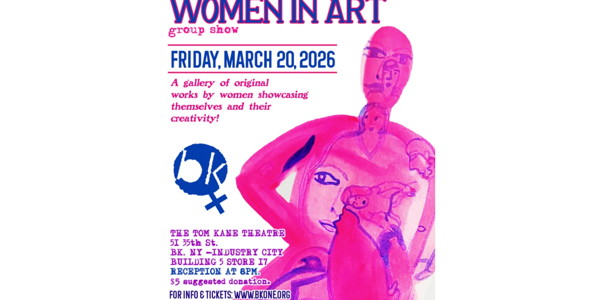 brooklynONE productions presents Women in Art, a vibrant group exhibition celebrating original works created by women artists who are boldly expressing themselves and their creative vision. This evening brings together a dynamic range of styles, mediums, and perspectives in one powerful, colorful gallery experience. From intimate personal narratives to striking visual statements, each piece reflects the individuality and artistic voice of its creator. Expect conversation, community, and work that sparks something real. Join us at The Tom Kane Theatre in Industry City for an 8PM reception, meet the artists, connect with fellow creatives, and support independent art in Brooklyn. $10 RSVP Your RSVP directly supports brooklynONE productions and helps us continue producing independent theatre, exhibitions, and community-driven arts programming throughout the year.