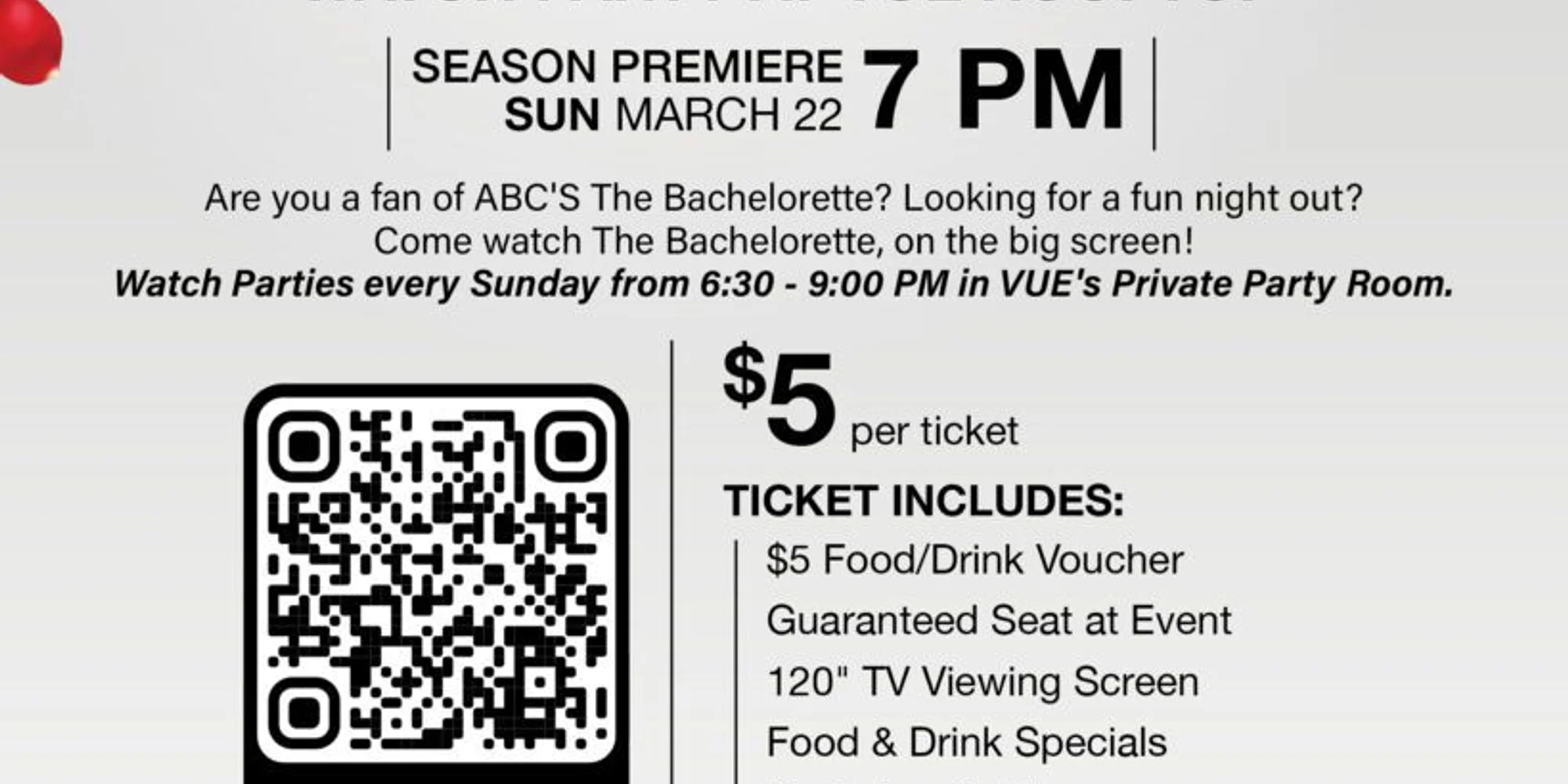 THE BACHELORETTE | Viewing Party | Every Sunday, Starting March 22 | 6:30 PM – 9:00 PM Are you a fan of ABC’S The Bachelorette? Looking for a fun night out? Come watch The Bachelorette, on the big screen! Watch Parties every Sunday from 6:30 – 9:00 PM in VUE’s Private Party Room. $5 per ticket + tax $5 voucher given at check-in if ticket is bought online If available, tickets may be purchased at the door for $5 (Cash only) (Food & drink voucher not included) Ticket Includes: $5 Food/Drink Voucher Guaranteed Seat at Event 120″ TV Viewing Screen Bachelorette Bingo (Prizes Awarded!) Menu Girl Dinner Special Caesar Salad, Grilled/Crispy Chicken, and La Jolie Rosé / 22 Drink Specials MomTok Mule / 9 Tito’s, Prickly Pear Syrup, Herb Simple Syrup, Lime Juice, Ginger Beer The Final Rose / 11 Ketel One Grapefruit & Rose, Cointreau, Prickly Pear Syrup, Herb Simple, Lime Sour Ceremony Sipper (Mocktail) / 8 NA Gin, Herb Simple, Blueberry Sour