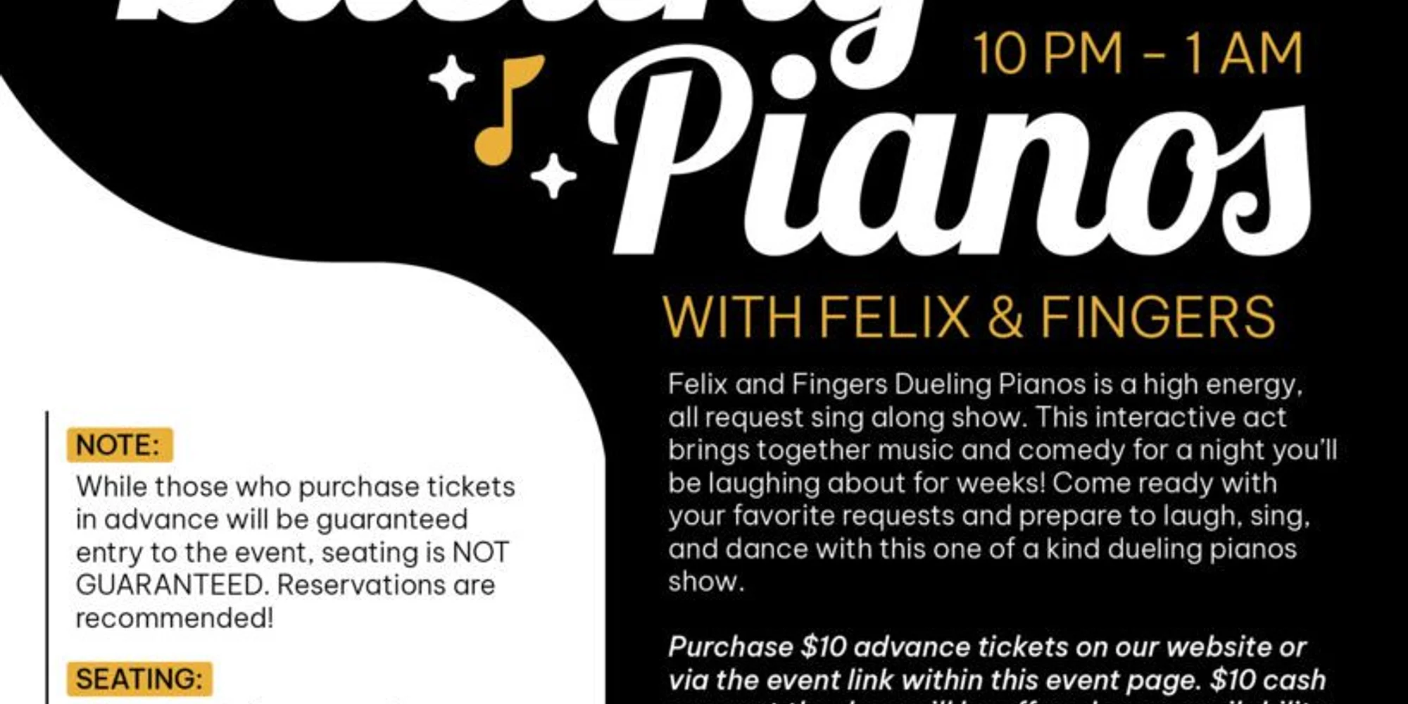 Felix and Fingers Dueling Pianos is a high-energy, all-request sing-along show. This interactive act brings together music and comedy for a night you’ll be laughing about for weeks! From John Lennon to John Legend, Beach Boys to Beastie Boys, Felix and Fingers will play anything. Come ready with your favorite requests and prepare to laugh, sing, and dance with this one-of-a-kind dueling pianos show. Great for birthday parties, reunions, and bachelorette parties! $10 Advance Tickets or $10 cash cover at the door upon availability. Advance ticket purchase is available for everyone! While those who purchase tickets in advance will be guaranteed entry to the event, seating is NOT GUARANTEED. What is Dueling Pianos? It’s a high-energy sing-along for all ages featuring 2 pianos, 2 wildly skilled players, and a dance floor if you feel like busting a move! What type of music do they play? The high energy and comedic players will surprise and delight you with their extreme range from John Lennon, to John Legend, to beach boys, to Disney musicals. You request it and they can probably play it! What should I bring? Your friends – because it’s always more fun when you can share the fun Your song requests – we’re not kidding when we say they can play almost anything! Your energy – The Felix and Fingers players thrive on audience participation Seating All seating is first come first serve. Seating is limited so please plan to arrive early as these events typically fill to standing-room-only capacity. Dinner If you plan on joining us for dinner before the show please make a separate dinner reservation by emailing info@vuerooftop-ic.com