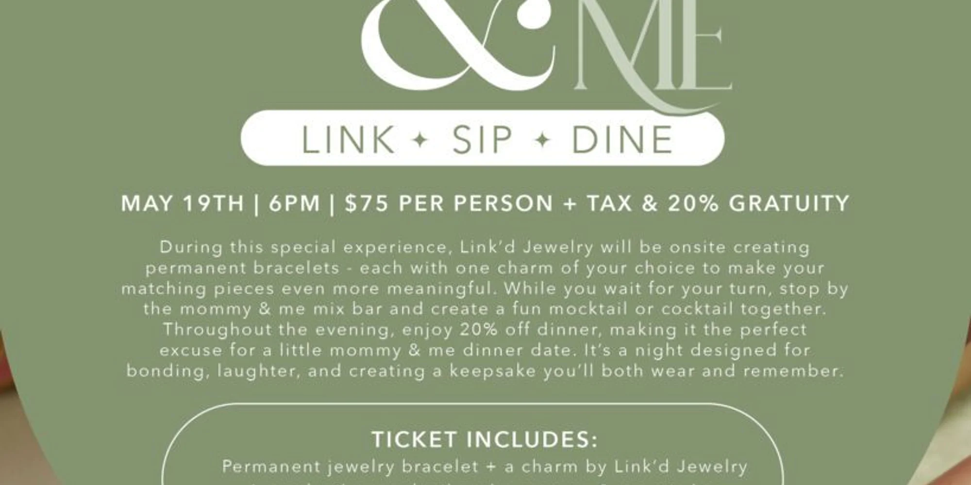 During this special experience, Link’d Jewelry will be on site custom-fitting permanent bracelets — each with one charm of your choice to make your matching pieces even more meaningful. While you wait for your turn, stop by the mommy & me sip bar — create your own custom mocktail or cocktail together. Capture the moment with a polaroid photo keepsake at our dedicated photo station. Throughout the evening, enjoy 20% off dinner, making it the perfect excuse for a little mommy & me dinner date. It’s a night designed for bonding, laughter, and creating keepsakes you’ll both wear and remember. Ticket includes: permanent jewelry bracelet + a charm by Link’d Jewelry Mommy & me drink bar experience — custom-crafted mocktail or cocktail A Polaroid photo keepsake captured at our photo station 20% off an entree for dinner