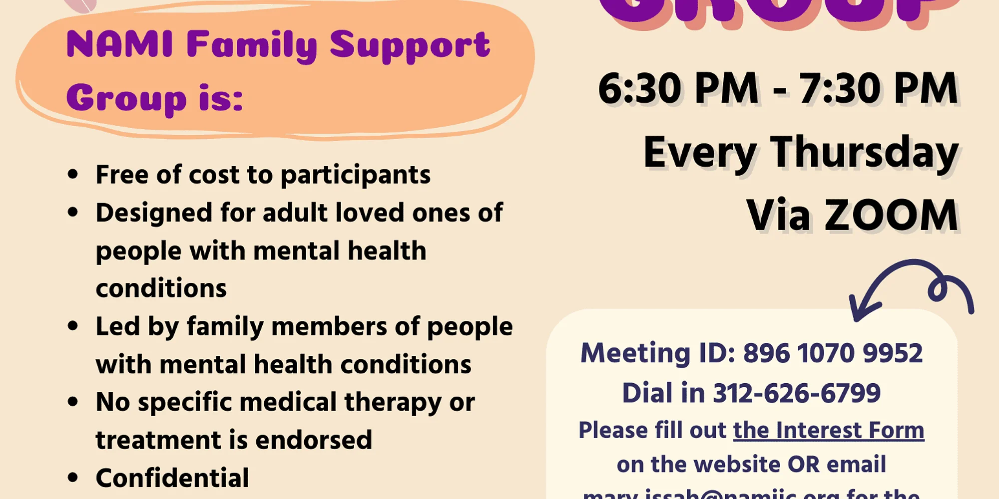 NAMI Family Support Group is a peer-led support group for any adult with a loved one who has experienced symptoms of a mental health condition. Gain insight from the challenges and successes of others facing similar experiences. NAMI’s support groups are unique because they follow a structured model, ensuring everyone has an opportunity to be heard and to get what they need. Free of cost to participants Designed for adult loved ones of people with mental health conditions Led by family members of people with mental health conditions 60-90 minutes long and meets weekly, every other week or monthly (varies by location) No specific medical therapy or treatment is endorsed Confidential
