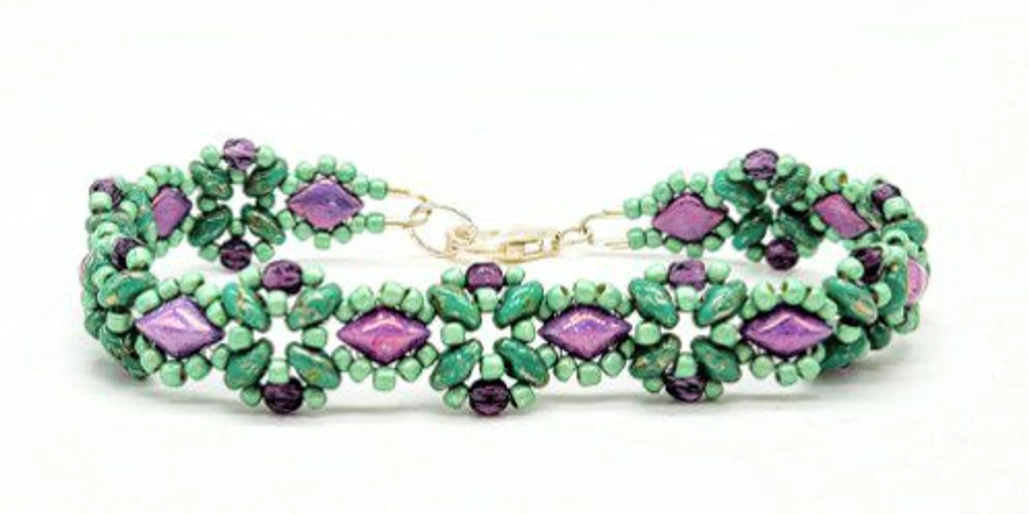 Date and Time: 03/31/2026 from 5:30 PM – 8:30 PM Capacity: 6 Instructor: Karen Kubby Prerequisites: No experience needed. Use GemDuos, SuperDuos, Czech fire polish, and Toho seed beads to make this lovely bracelet. This a fun and fast project. This pattern makes for a beautiful close-up necklace as well. Registration is through Kirkwood Community College. Register at: kirkwood.edu On site registrations will be taken if registration through Kirkwood meets minimum requirements of two participants.