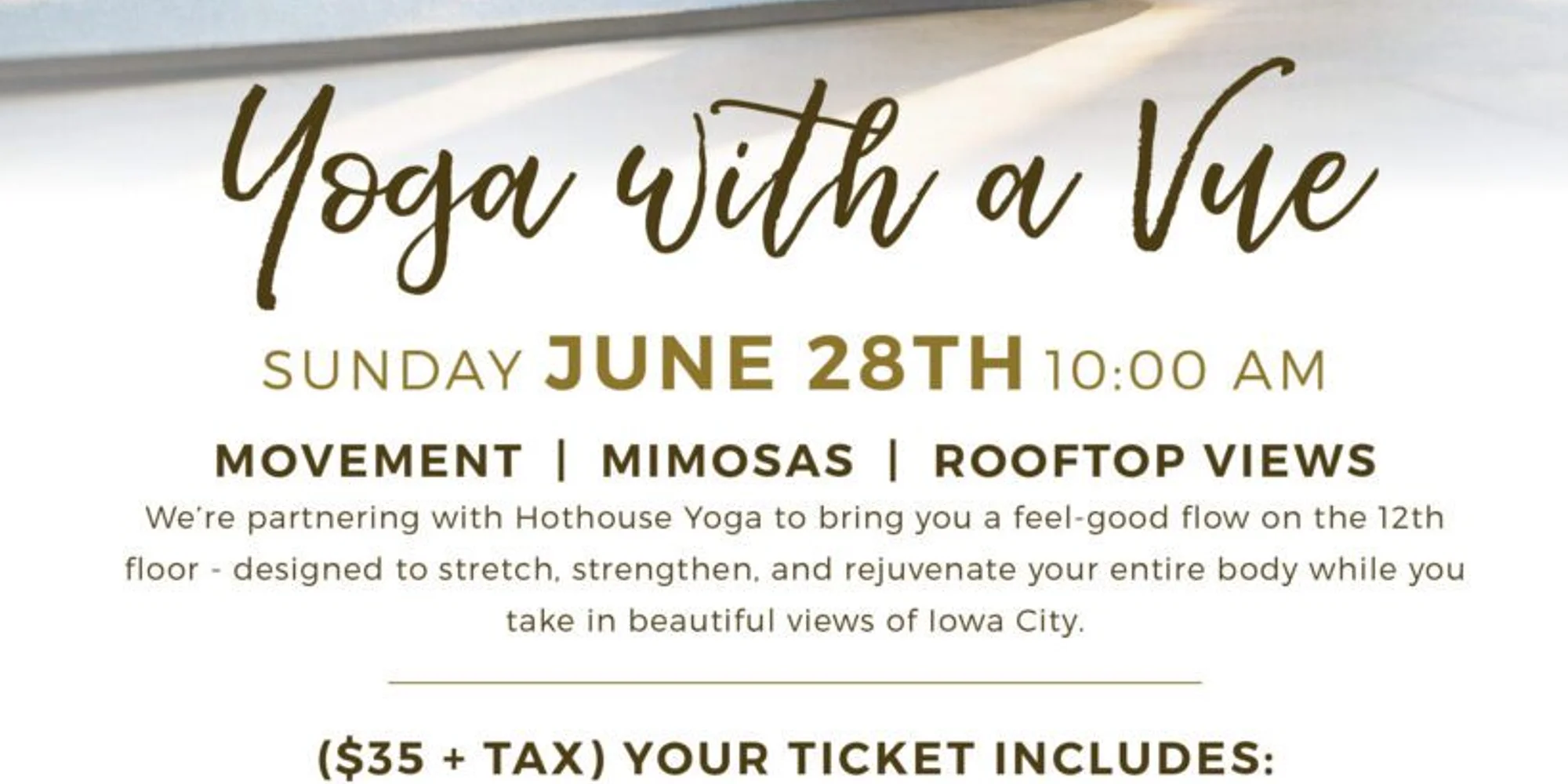Join us for a morning of movement, mimosas, and rooftop views. We’re partnering with Hothouse Yoga to bring you a feel-good flow on the 12th floor – designed to stretch, strengthen, and rejuvenate your entire body while you take in beautiful views of Iowa City. Your $35 ticket includes: A one-hour guided rooftop yoga session on our outdoor rooftop patio Two mimosas at a mimosa bar 20% off brunch Start your Sunday feeling refreshed, restored, and ready for brunch. *Event will take place on our rooftop patio, weather permitting. In the event of rain, this session will be held in our private party room where you’ll still be able to take in all the views. Please arrive 30 minutes early to check in and set up your mat.