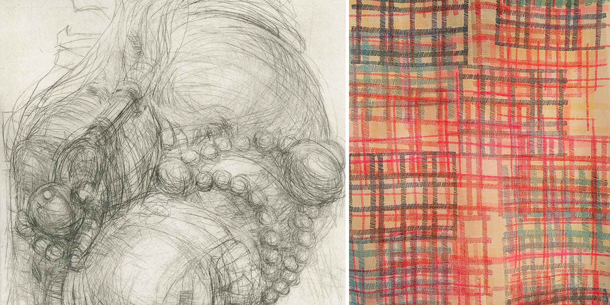 Repeat | Jessica Warner & Kat Moore 2025-26 Fellowship Exhibit The Ink Shop is excited to present the work of Jessica Warner (Kahn Family Fellow) and Kat Moore (Fred Madden Fellow). Jessica explores movement, change and the passage of time through processes that involve accumulation, repetition and contradiction. The unsettled state of the world currently is a backdrop for exploring the parallel forward and backward movement of cycles of creation and destruction. Drawn to the CMYK screenprinting method, Kat layers color as a way to map the complexities of perception and thought and is obsessed with incorporating textiles, whether physical or implied. “I stitch together the fragments of the inner and outer worlds that I move through.” This body of work consists of sheer curtains layered with hand-drawn screenprinted plaid prints and images of a particularly important moment of self-reflection. Drawing each line in the plaid is a repetitive action that reflects the repetitive nature of screenprinting. This repetitive process has also revealed itself as a personal coping mechanism for my own navigation of obsessive thought patterns. As I layer the controlled patterns of plaid with the layers of an image of a natural space, I consider the notion of how obsessive thoughts work in tandem against the natural flowing of changes in one’s environment. No matter how much you extract each layer of obsessive thoughts, the patterns of self-realization eventually emerge.