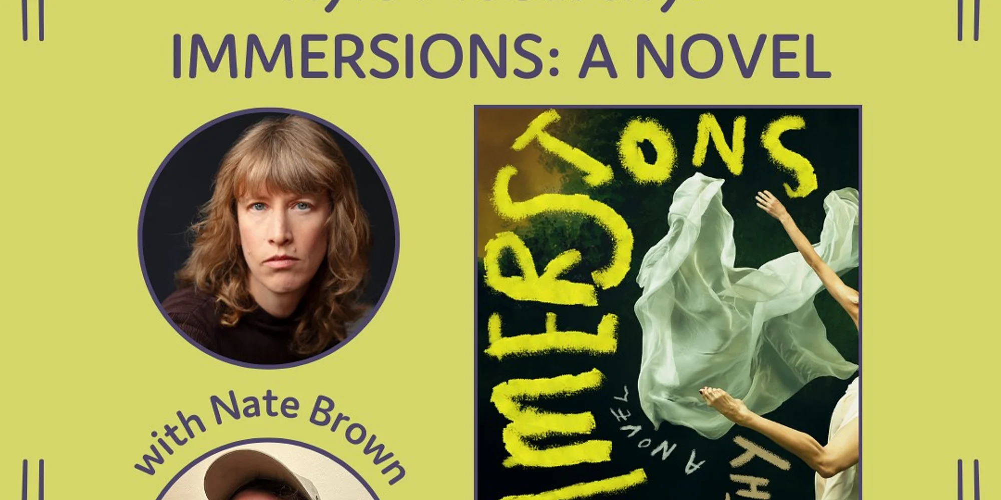 Kyle McCarthy launches her new novel, IMMERSIONS, on the Ivy patio in conversation with Nate Brown! Taut and spellbinding, IMMERSIONS follows the aftermath of a celebrated dancer’s abrupt decision to quit her company and join an enclosed convent in France, and her younger sister’s obsessive conviction that her sister’s ex-husband is responsible. With art, family, and questions of desire front-and-center, this is a novel you’ll be thinking about long after you read it– and a conversation that’s sure to stick with us all long after the event. We’ll see you there! RSVP here! Order IMMERSIONS here! Kyle McCarthy is the author of the novel Everyone Knows How Much I Love You, and her fiction and essays have appeared in Best American Short Stories, American Short Fiction, n+1, and elsewhere. A graduate of the Iowa Writers’ Workshop, she lives in Brooklyn, New York. Nate Brown’s stories, essays, and reviews have appeared in One Story, the Iowa Review, Mississippi Review, the Los Angeles Review of Books, the Rumpus, Electric Literature, Publisher’s Weekly, LitHub, and elsewhere. He is editor-at-large of the award-winning literary journal American Short Fiction in Austin, TX and is a senior lecturer in the University Writing Program at Johns Hopkins University.