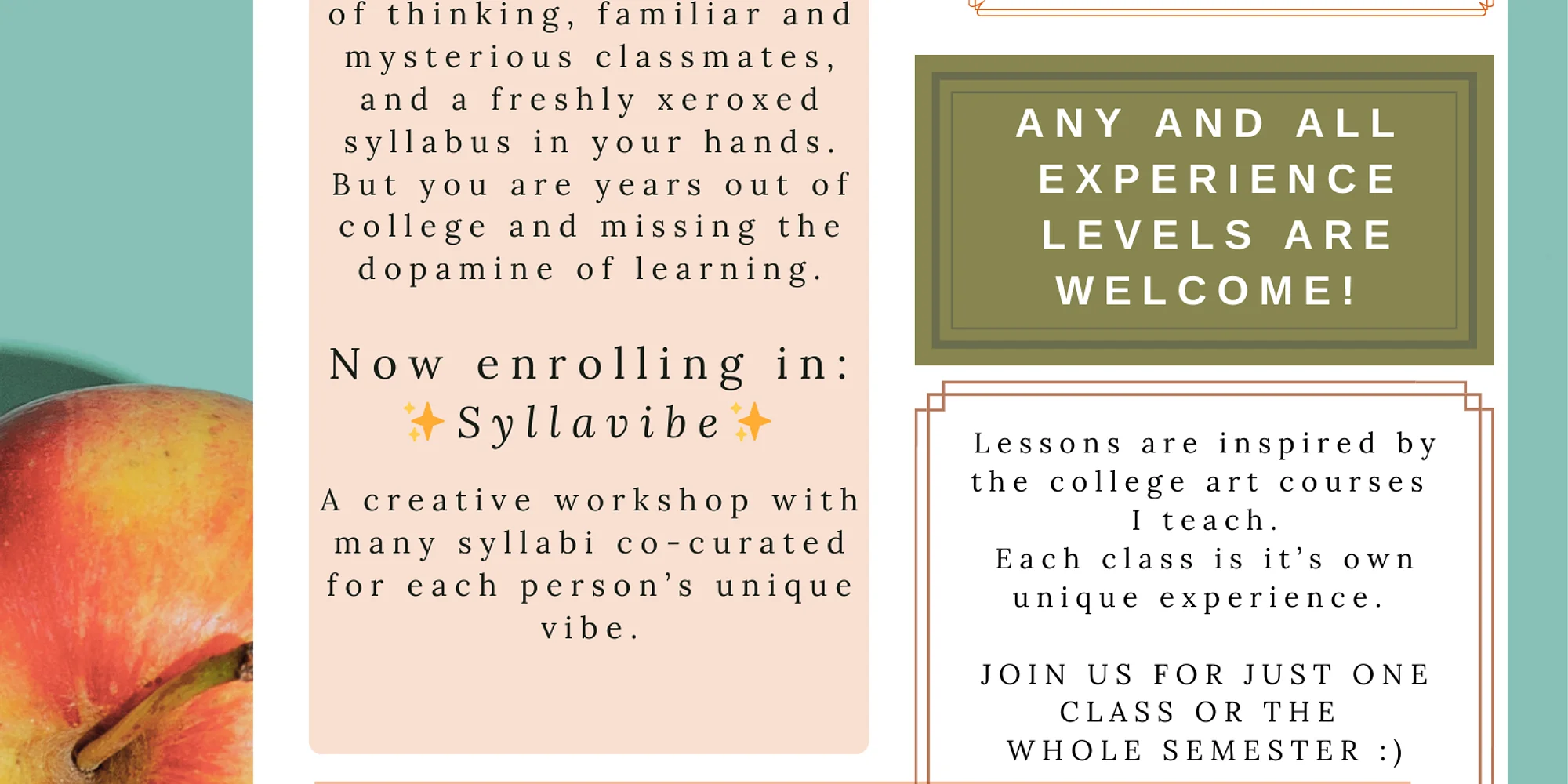 Back for its second year at KSW, Syllavibe is a semester-long creative workshop for artists looking to self-motivate and work on projects together. Scan the QR code for more info! Regular attendance encouraged but not required. The suggested donation per-class is $20 cash or $25 via Venmo.