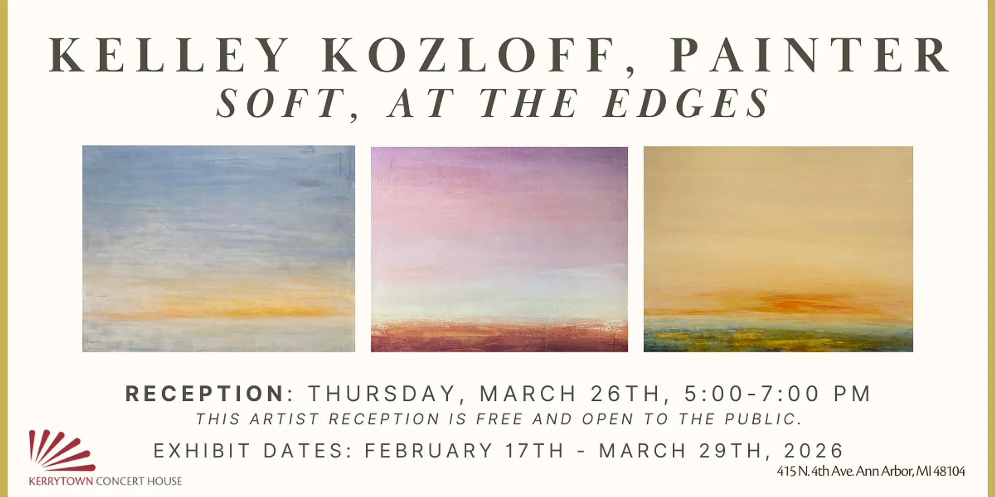 @ET-DC@eyJkeW5hbWljIjp0cnVlLCJjb250ZW50IjoicG9zdF90aXRsZSIsInNldHRpbmdzIjp7ImJlZm9yZSI6IiIsImFmdGVyIjoiIn19@@ET-DC@eyJkeW5hbWljIjp0cnVlLCJjb250ZW50IjoicG9zdF90aXRsZSIsInNldHRpbmdzIjp7ImJlZm9yZSI6IjxoMT4iLCJhZnRlciI6IjwvaDE+In19@ Exhibit showing: February 17th – March 29th, 2026 Artist reception: Thursday, March 26th from 5-7 PM Reception & exhibit are free and open to the public. Exhibit may be viewed before and after concerts and by appointment (734) 769-2999 or kch@kerrytownconcerthouse.com Exhibit description: A collection of abstract landscape and seascape oil and cold wax paintings by Ann Arbor artist Kelley Kozloff. Her multi-layer artwork puts imagined horizons in soft focus over underlying complexity. Artist statement: My art evokes the peace of mind that I experience when viewing a large body of water or a landscape that is simply earth and sky. My paintings are abstract creations from my imagination intended to lead the viewer to their own place of peace. Artist Bio: Kelley Kozloff is a painter based in Ann Arbor, MI. She paints with oils and cold wax medium on canvas or wood to create multi-layered and textured pieces. Following years in careers in occupational therapy and non-profit management, Kelley began painting with oils and cold wax medium in the fall of 2021. She loves the kinesthetic experience of creating her work and the personal connections she has developed as an artist with collectors and fellow artists. Kelley was selected as an Emerging Artist at the 2023 Ann Arbor Summer Art Fair and has continued to show at juried art fairs since, including the 2025 Spring One of Kind in Chicago and the 2025 Ann Arbor Summer Art Fair. In 2024, Kelley had her first solo exhibition, Infinite horizons, at The Common Cup in Ann Arbor, Michigan. This was quickly followed with a January/February 2025 solo exhibition at the Chris Nordin Studios-Gallery. In May 2025, Kelley was chosen as the first artist for a three month solo exhibit through the Gutman Gallery at Bamboo for the summer. https://www.kelleykozloff.com/ https://www.instagram.com/kelleykoz_art/ SAMPLES FROM THE GALLERY