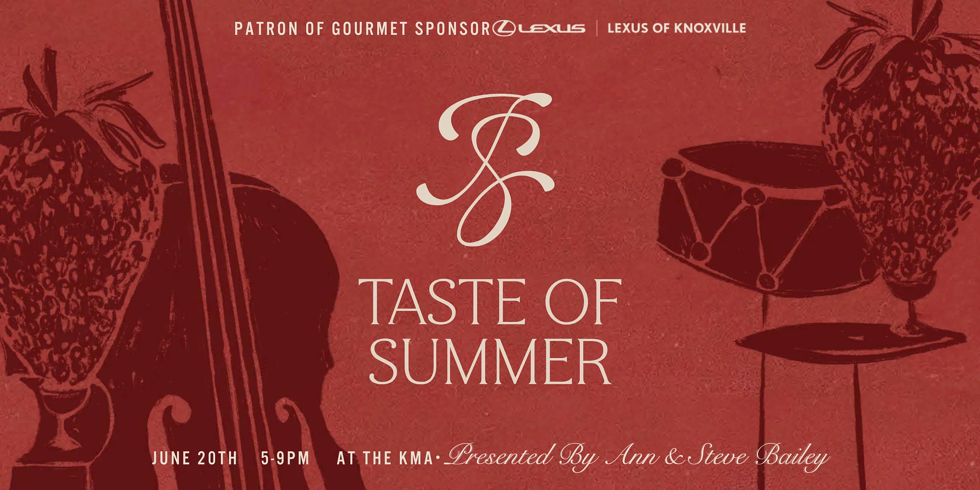 Sip, savor, and celebrate the essence of summer. Join us for Taste of Summer: Wine and Food Festival- an unforgettable evening where culinary artistry meets world-class winemaking. Set against the vibrant backdrop of the Knoxville Museum of Art, this immersive experience brings together the very best of our local food scene and the refined elegance of vineyards across the world. What to Expect: Indulge in signature bites crafted by 8–12 of Knoxville’s most talented chefs, each dish thoughtfully paired with exquisite selections from renowned wineries. From bold reds to crisp whites and refreshing rosés, every sip tells a story of craftsmanship and tradition. The Experience: Mingle with fellow food and wine enthusiasts in a relaxed, festive atmosphere designed to delight the senses. Whether you’re a seasoned collector or simply love great taste, this is your invitation to discover, connect, and indulge. When & Where: Saturday, June 20, 2026 | 5:00 PM – 9:00 PM Knoxville Museum of Art (Rain or shine) Tickets: $175 per person Must be 21 years or older to attend Questions? Email: tlolley@knoxart.org Event Presented by Ann & Steve Bailey Presenting Sponsor: Lexus of Knoxville