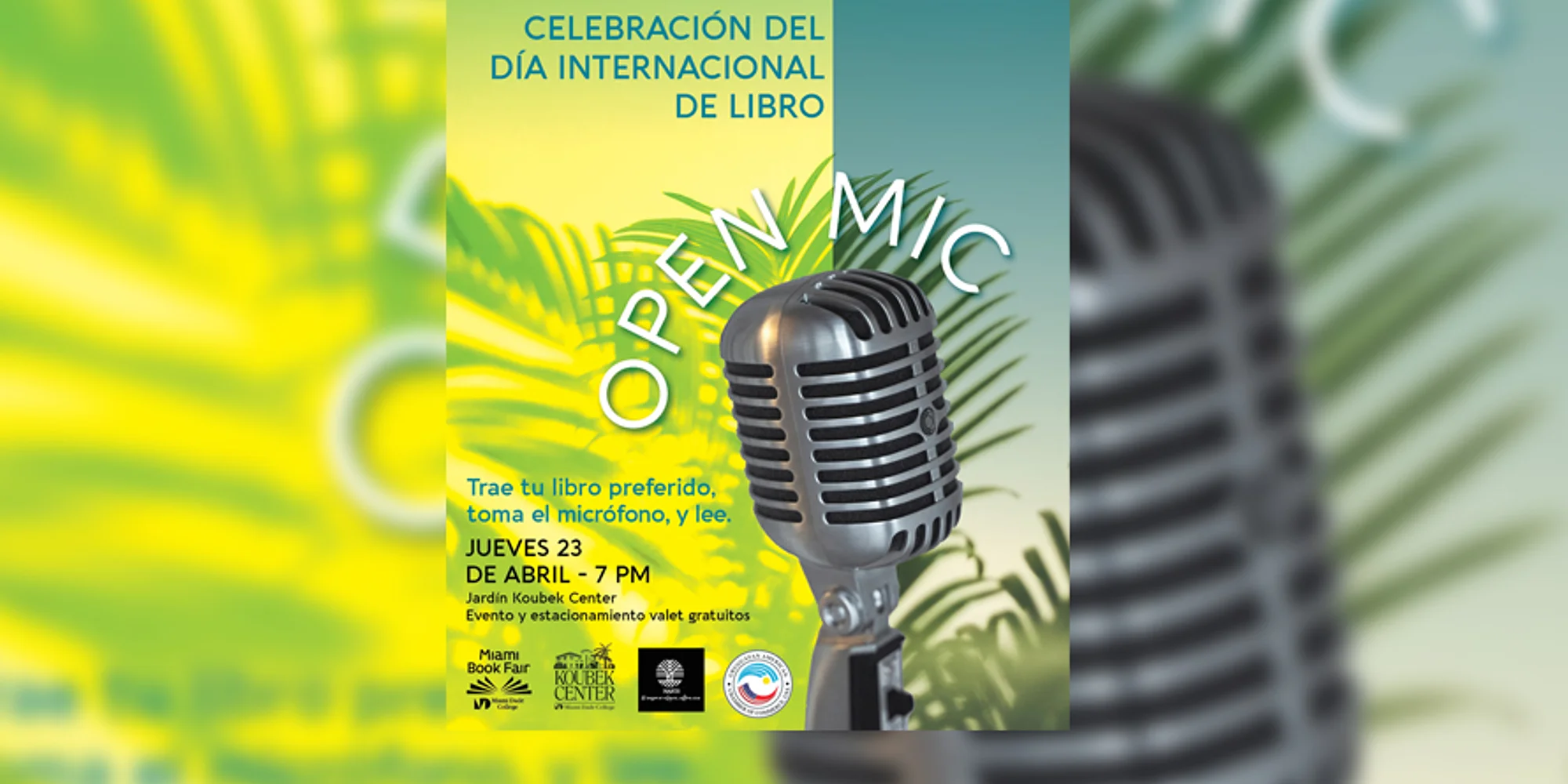 ¡Celebremos el Día Internacional del Libro: Open Mic al aire libre! La Feria del Libro de Miami y Koubek Center en colaboración con Narts Foundation y el apoyo de la Cámara de Comercio de Uruguay en Miami, te invitan a una noche mágica de OPEN MIC para celebrar el Día Internacional del Libro. Ven a celebrar la literatura en castellano y a escuchar a escritores compartiendo fragmentos de obras de otros autores. Habrá libros, música y un brindis bajo las estrellas. Nos acompañan y participan: Indira Páez, Camilo Pino, Germán Guerra, Hernán Vera Alvarez, Rosie Inguanzo, Alfredo Triff, Ena Columbié, Cemí Rodríguez, Legna Rodríguez Iglesias. 23 de abril – 7:00 PM Jardín Koubek Center Garden (2705 SW 3rd St. Miami) Estacionamiento valet gratuito. Entrada libre.