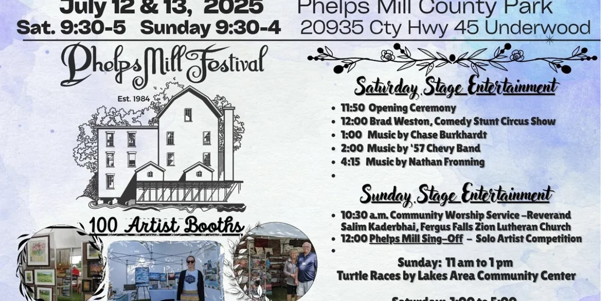 Learn more FEE: Adults- $8 | Children under 12 are Free Phelps Mill Festival July 11-12, 2026 With around 75 artist booths, 8 food vendors, 4 main stage acts, and numerous other sights and sounds, the Phelps Mill Festival is an event that truly every family member can enjoy. Annually, the Festival welcomes between 20,000 to 25,000 visitors every year, of all ages. With our handicapped accessible grounds, free parking, and Children's Activity area, we offer something for everyone, from the young to the old.