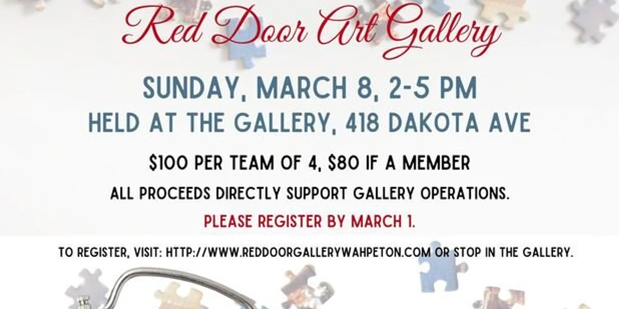 EVENT LINK: http://www.reddoorgallerywahpeton.com FEE: Member/Non- $80.00 - $104.00 🧩 SPRING AHEAD PUZZLE CONTEST 📅 Sunday, March 8 🕑 2:00–5:00 PM 📍 Red Door Art Gallery, 418 Dakota Ave Put your puzzle skills to the test at the Spring Ahead Puzzle Contest®, a fun team challenge benefiting Red Door Art Gallery. Teams of four will race against the clock to complete a puzzle—all while supporting local arts! 💵 $100 per team of 4 🎟️ $80 for gallery members ❤️ All proceeds directly support gallery operations 📝 Registration required by March 1 Register online at: http://www.reddoorgallerywahpeton.com —or sign up in person at the gallery.