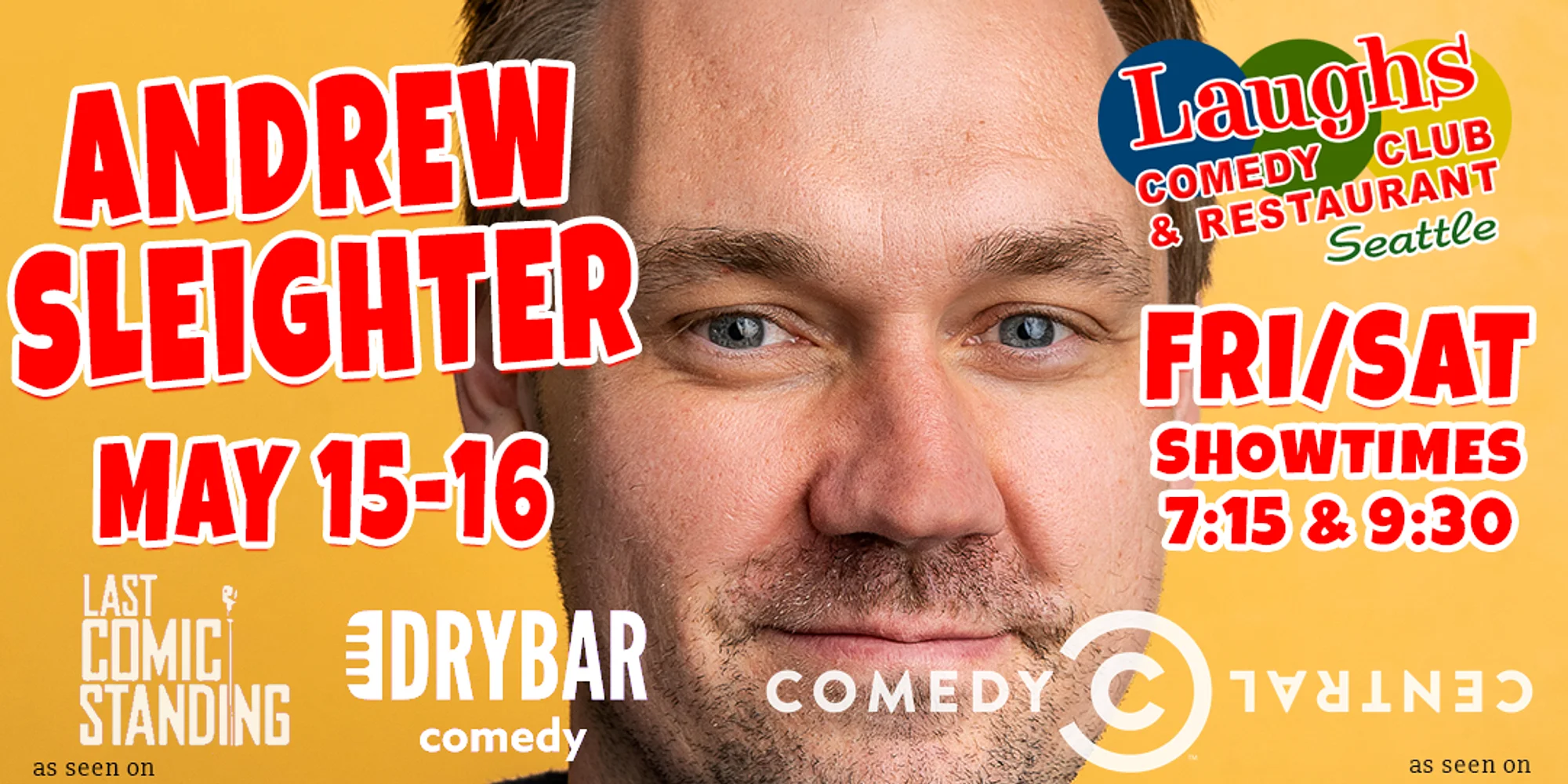 Join us for a hilarious night of comedy, Fri. and Sat. with doors at 6:30pm, 2 item menu minimum purchase with full bar and dinner Andrew Sleighter started in comedy looking for the perfect funny line to open a biography. Since then, Andrew’s laid-back style and clever writing has won him appreciation from fans and respect from his peers. Andrew performed on Last Comic Standing, recorded a comedy special for Dry Bar and made his late-night stand-up debut on Conan. He’s also written and performed sketch comedy for Comedy Central and wrote and blogged for the Sports Show with Norm Macdonald on Comedy Central. Most recently Andrew appeared on the Late Late Show with James Corden. A regular at colleges and comedy clubs across the country, Andrew’s also performed at some of the most prestigious comedy festivals in and out of the country including Bumbershoot, Bridgetown, Gilda’s Laugh Fest, The Aspen Comedy Festival, Laughing Skull, and the Johnny Carson Great American Comedy Festival. Andrew’s comedy has the ability to reach wide ranges of audiences and works in a diversity of rooms. Reliable and consistent, he rarely ends a show by lighting the stage on fire out of rage. Most importantly, he’s constantly fascinated by and eager to keep learning about stand-up.