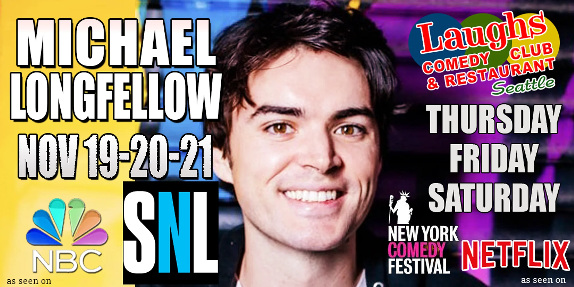 Join us for the laughs on Nov. 19th – 21st, 5 shows. 2 item minimum menu purchase, full bar and dinner service Michael Longfellow is a comedian and stepson from Phoenix who completed three seasons as a cast member on SATURDAY NIGHT LIVE. Prior to SNL, Michael was just one of eight comedians chosen for the inaugural “Netflix Introducing…” next stars of comedy showcase at the Netflix is a Joke Festival. He was also selected as one of TBS’s “Comics To Watch” at the New York Comedy Festival, and went on to make his late night debut on CONAN. He was a favorite on NBC’s comedy talent series Bring The Funny. Michael also regularly tours festivals and clubs around the country