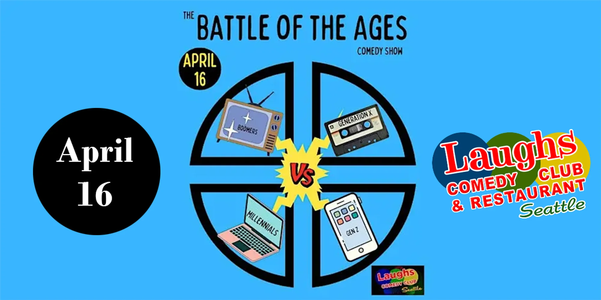 Four generations of comics face off in mortal combat, one survives – and you decide who! Boomers vs. Gen X vs. Millennials vs. Gen Z. We’re in quite the pickle these days. The question is whose fault is it? If you ask Gen X, it’s those greedy Boomers who are to blame. Gen Z has knives out for those rizz-lacking Millennials. Boomers think everyone younger than 65 is woke. And who can forget the glorious Boomer vs. Millennial War of 2019? We here at Mockingbird Comedy have decided to put an end to all this bickering with a Hunger Games-style competition: The Battle of the Ages Comedy Show. Host Andrew Frank will guide a dozen comedians representing four generations through a night of not-so-gentle combat at 7 p.m. on Thursday, April 16, at Laughs Comedy Club in Seattle. Tickets are $15 (before fees). The show is 18+ (screw you, Gen Alpha). Doors open at 6 p.m. Bring your parents or grandparents, drag along your adult kids. Come laugh with us!