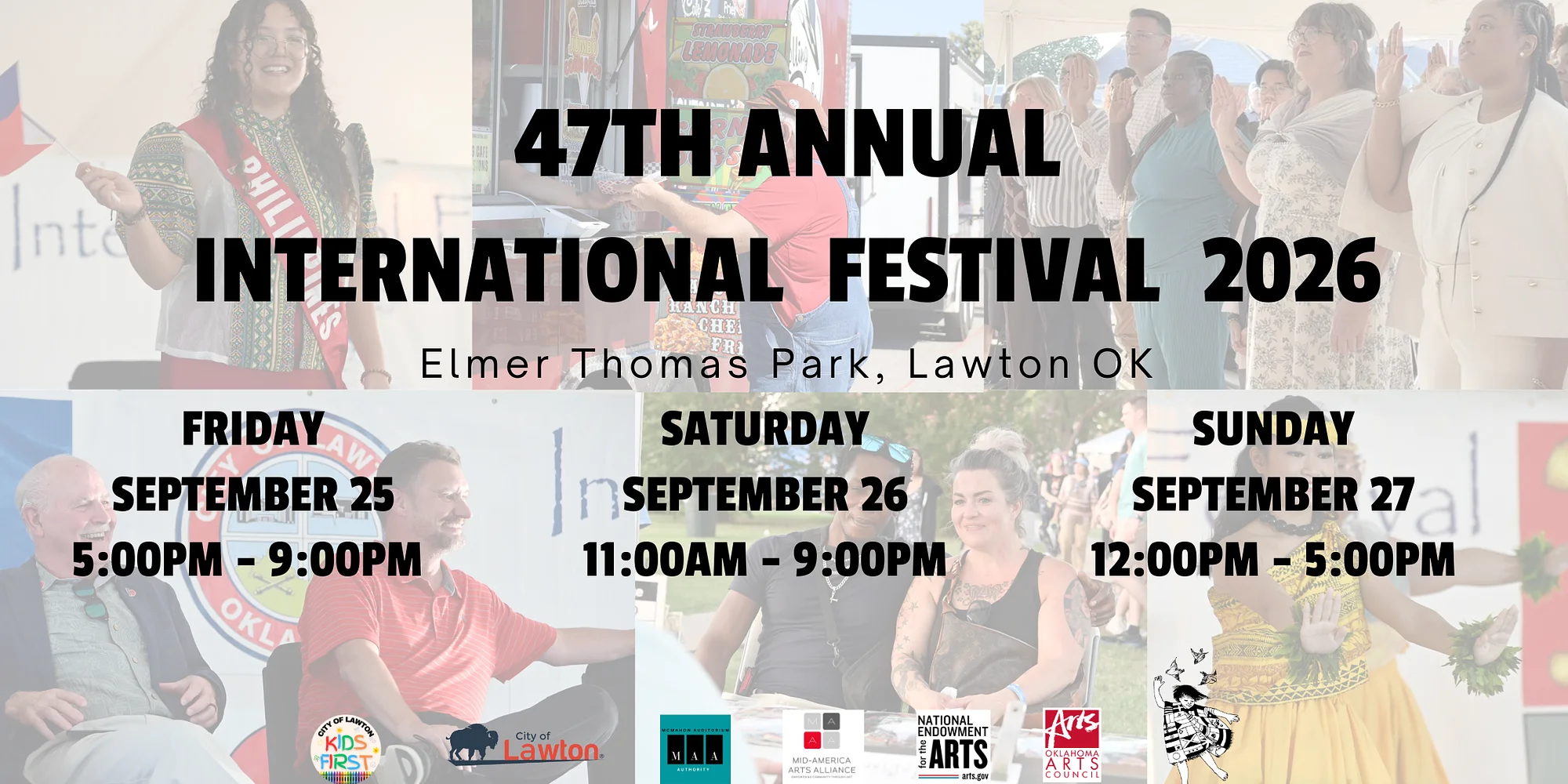 47th Annual International Festival 2026 Friday - Sunday, September 25-27, 2026 Elmer Thomas Park, 3rd & NW Ferris Ave, Lawton OK Vendor Applications Now Open! The International Festival Committee is thrilled to announce that applications are available for the 47th annual International Festival, happening Friday, September 25, Saturday, September 26, and Sunday, September 27, 2026, at Elmer Thomas Park! This family-friendly event is packed with fun activities, games, vendors, and entertainment! Vendors: Don’t miss your chance to be part of the excitement! Apply now here! Applications are due by Thursday, July 2, 2026. Stay up to date with festival news by following the International Festival Facebook Page! and checking back in to the International Festival Official Page!
