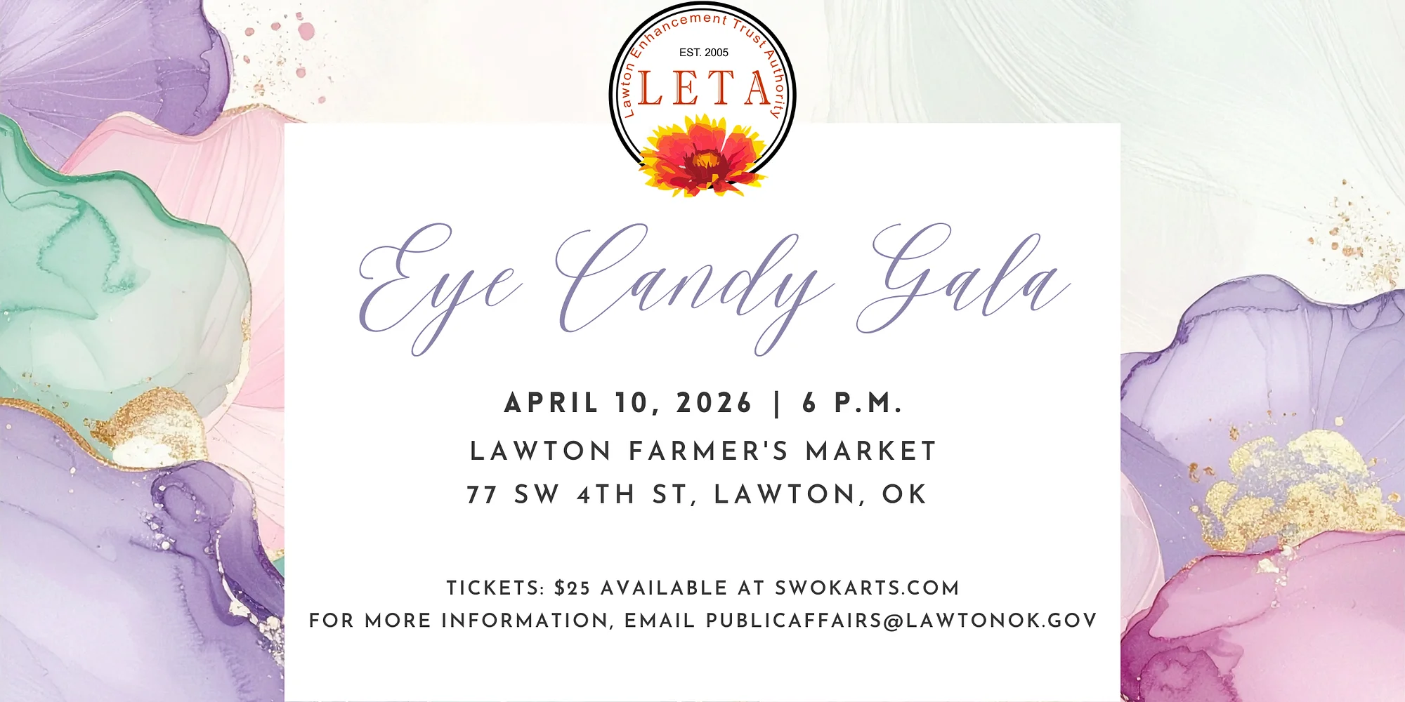 You are cordially invited to Lawton Enhancement Trust Authority's Annual Eye Candy Gala! APRIL 10, 2026 | 6 P.M. | LAWTON FARMER'S MARKET - 77 SW 4th St, Lawton, OK Tickets: $25 available here! For nominations click here! Nominations close on Thursday, March 5. For more information, email publicaffairs@lawtonok.gov